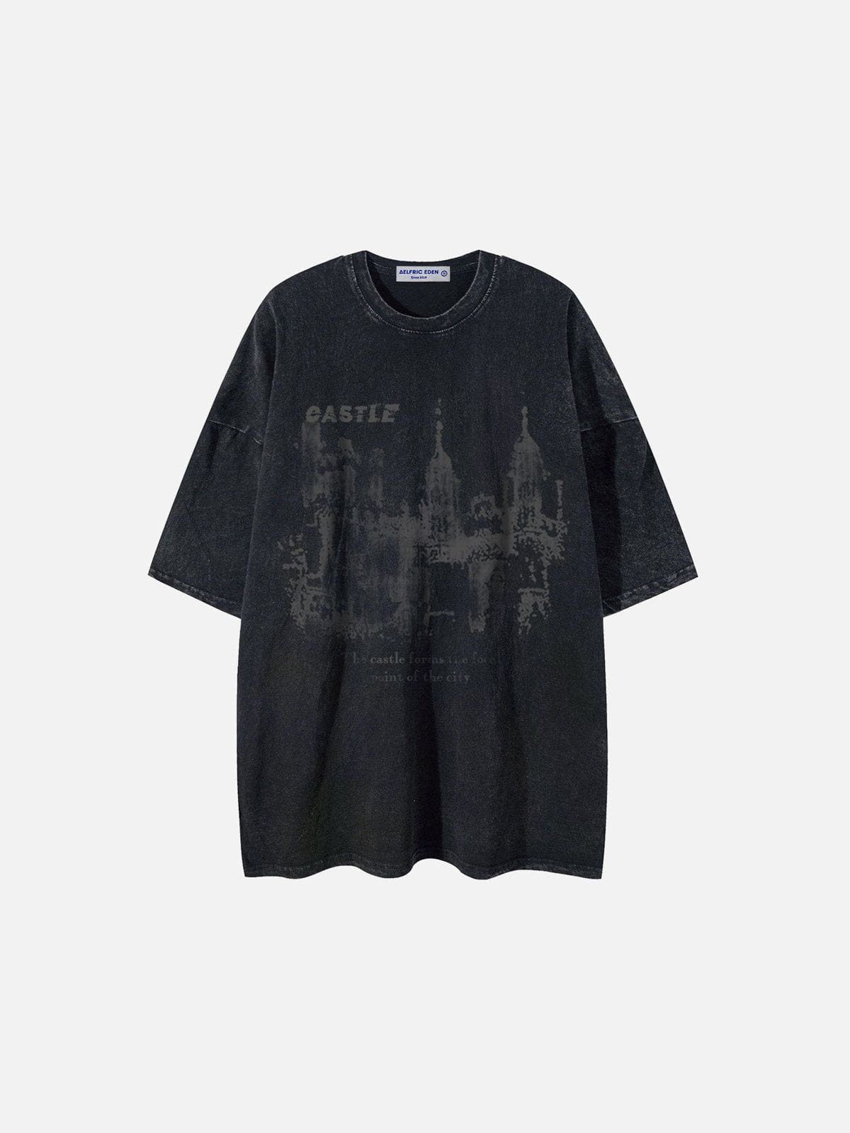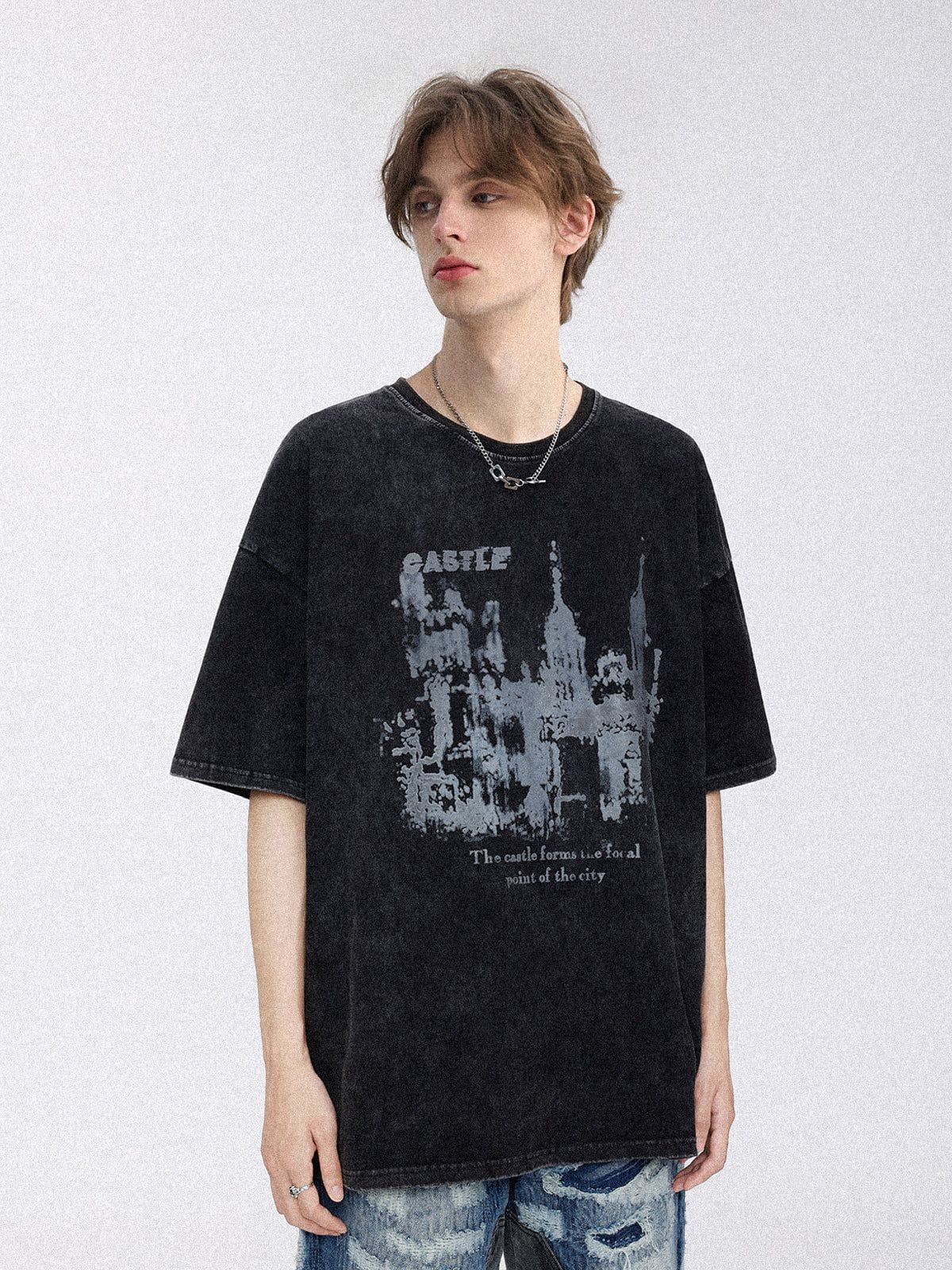 Discover a bold style and timeless look with Fvshya Castle Graphic Washed Tee. Crafted from soft cotton, this tee features a striking castle graphic and washed-tone for an edgy vibe. Elevate your wardrobe with this timelessly stylish piece.