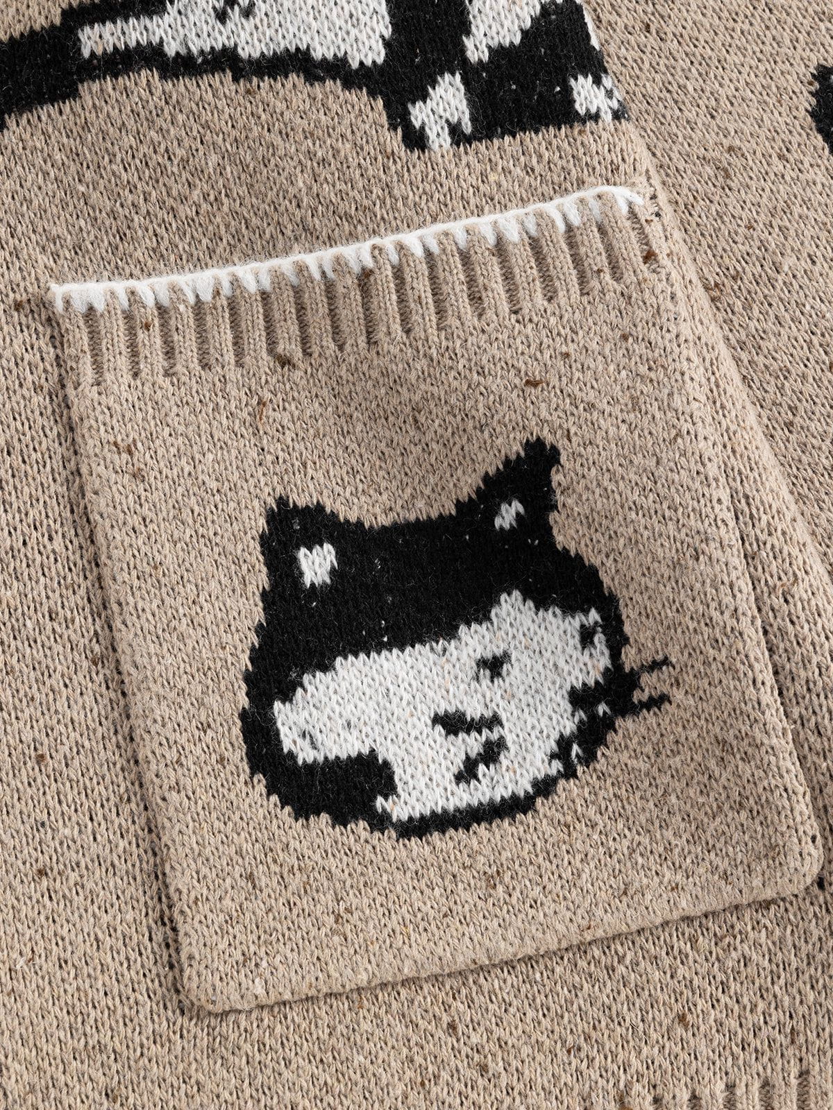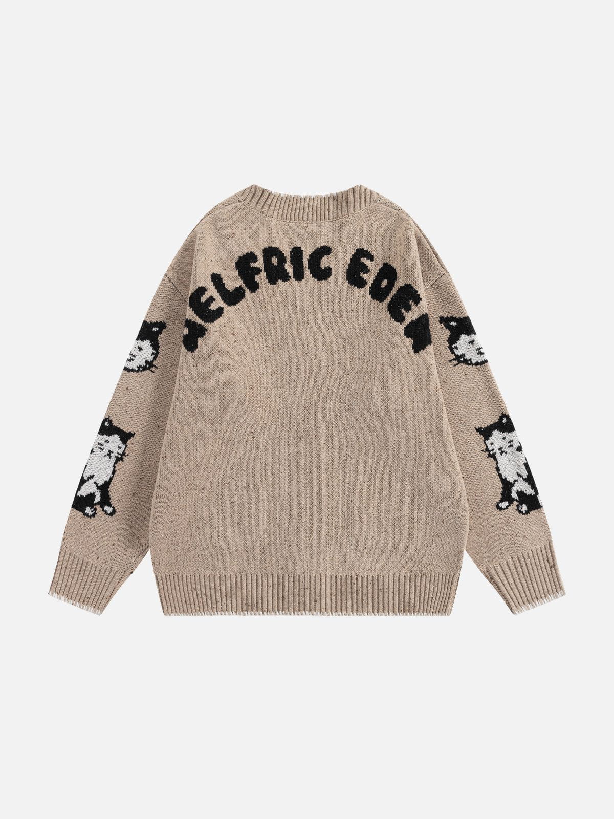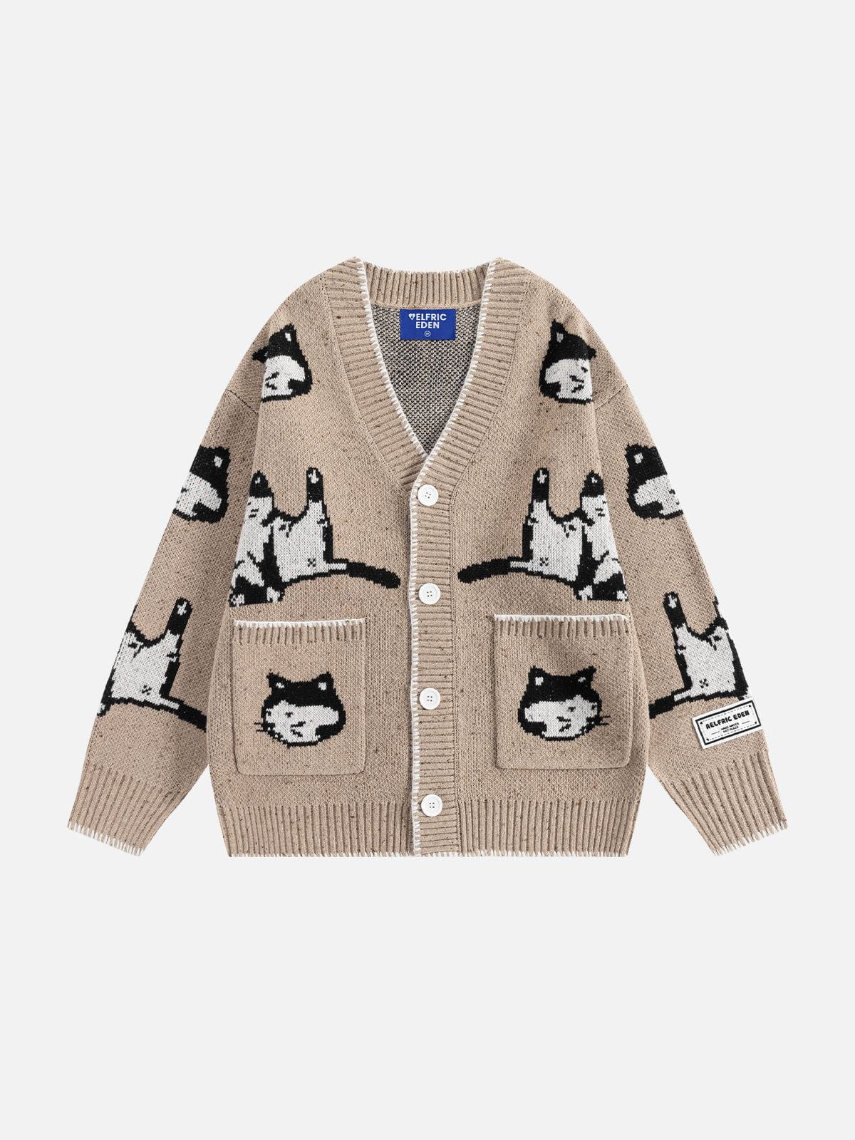 The Fvshya Cats Jacquard Cardigan showcases charming hand-drawn cat illustrations throughout its cozy fabric. Designed to provide warmth and a touch of artistic flair, this cardigan supports a playful yet comfortable style perfect for everyday wear.