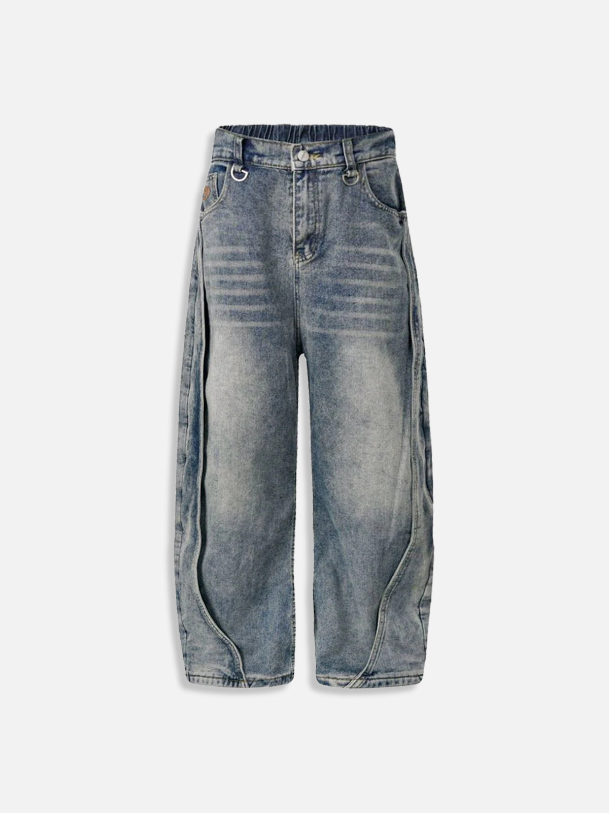 Featuring a unique curved panel design that adds a modern, artistic twist. Crafted from washed denim for a soft, vintage-inspired look, these jeans offer a perfect blend of style and comfort.