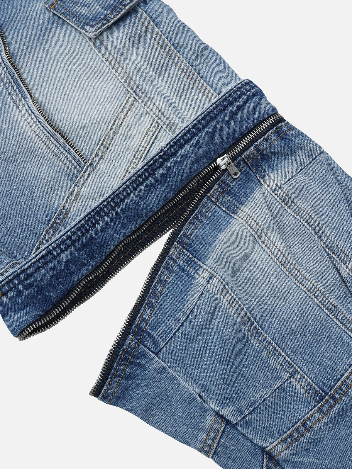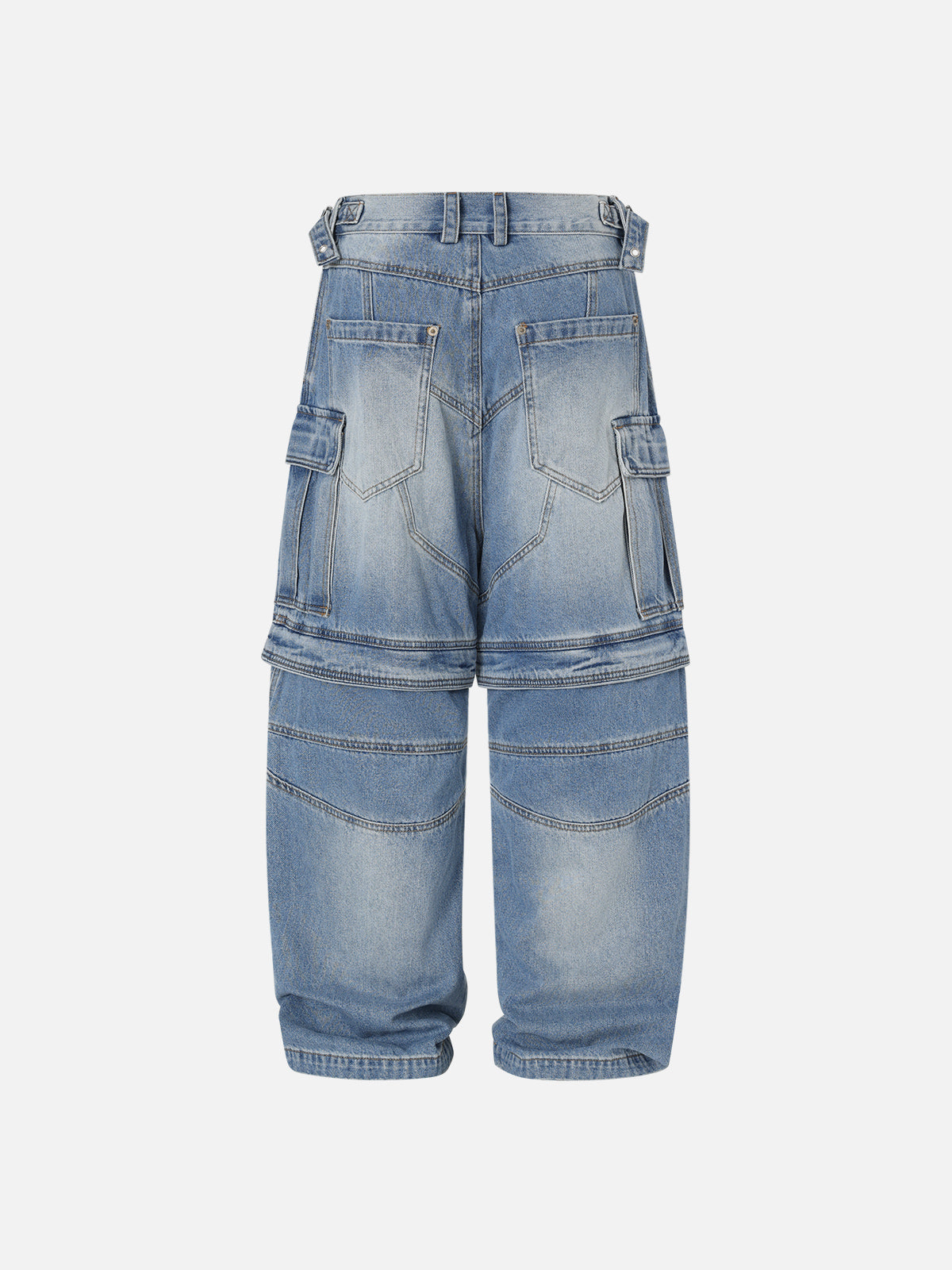 Convertible cargo jeans with a super baggy silhouette and bold washed finish. Articulated seam lines and large pockets add a utility edge. The zip-off design transforms them into shorts for versatile street styling.