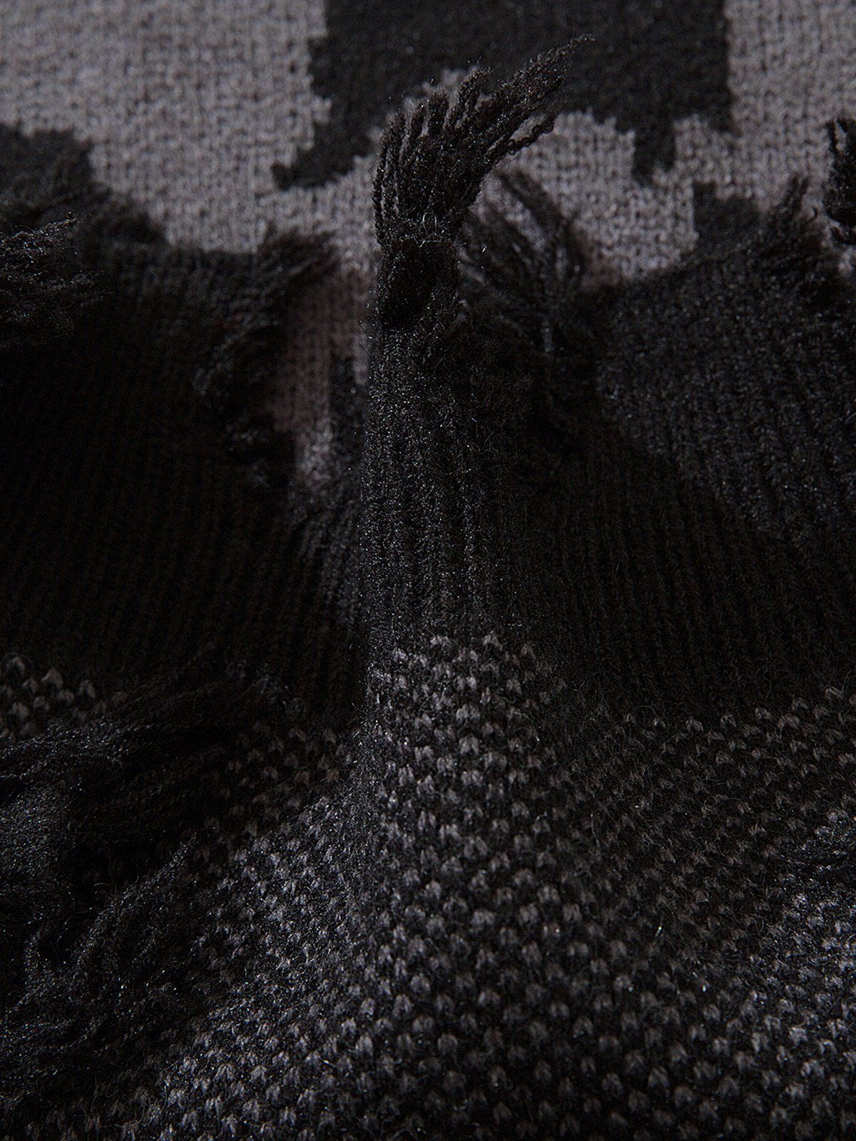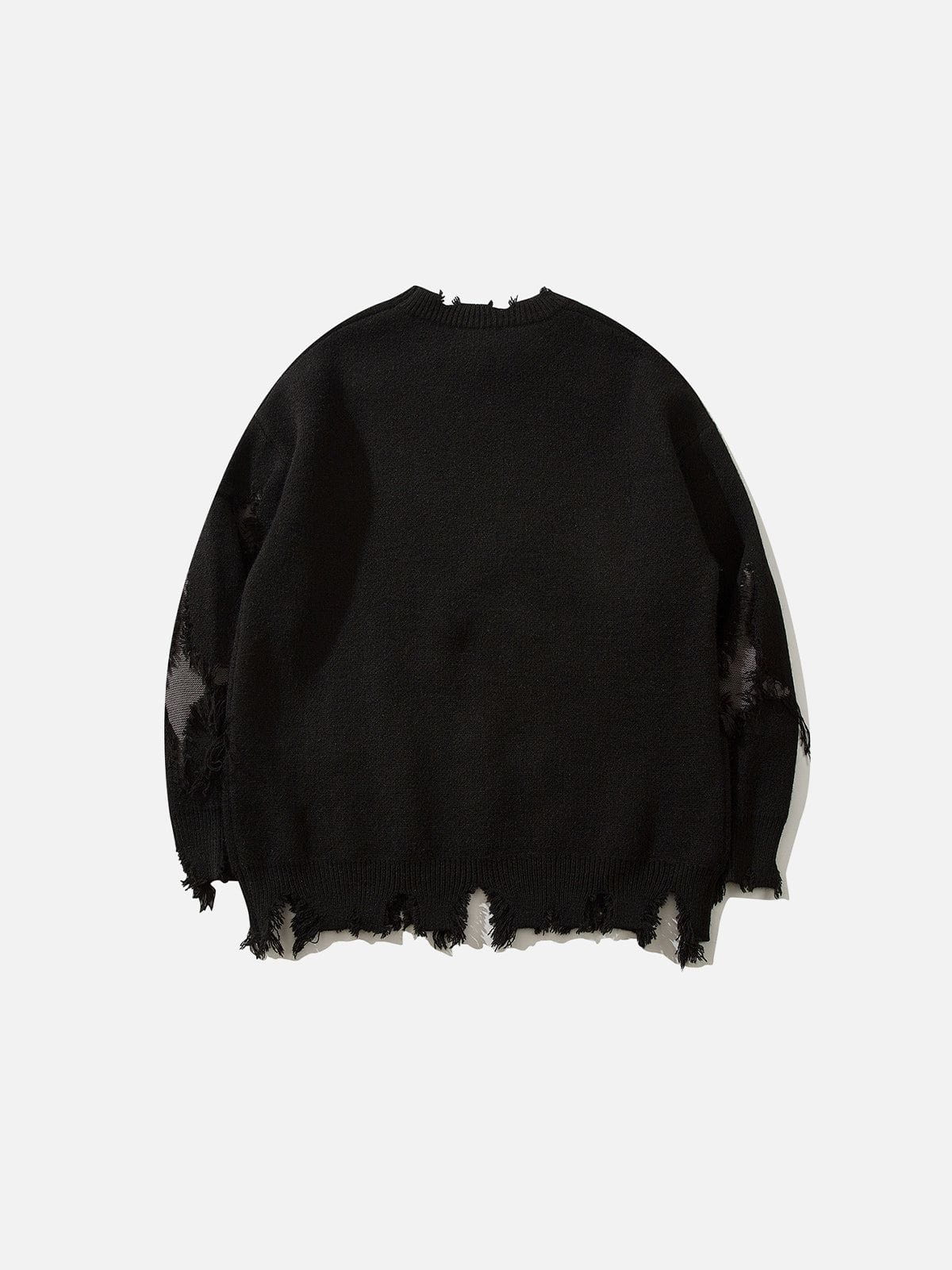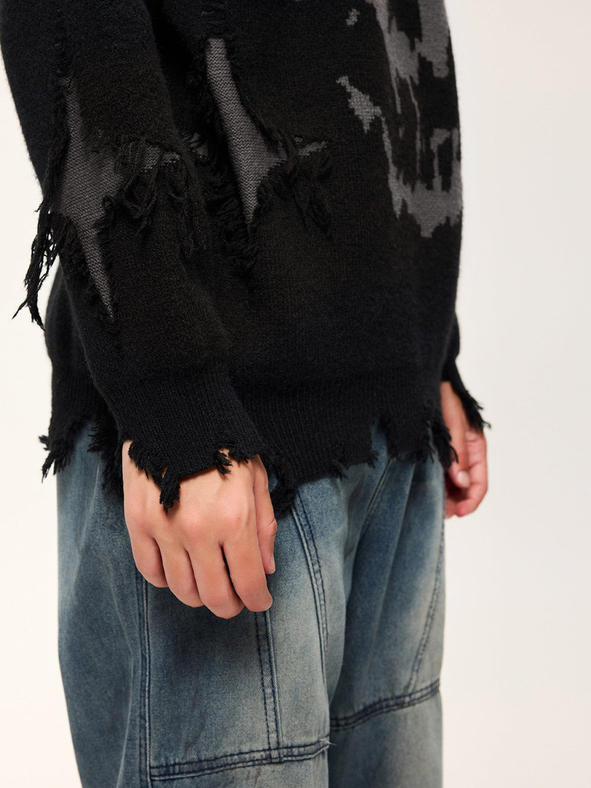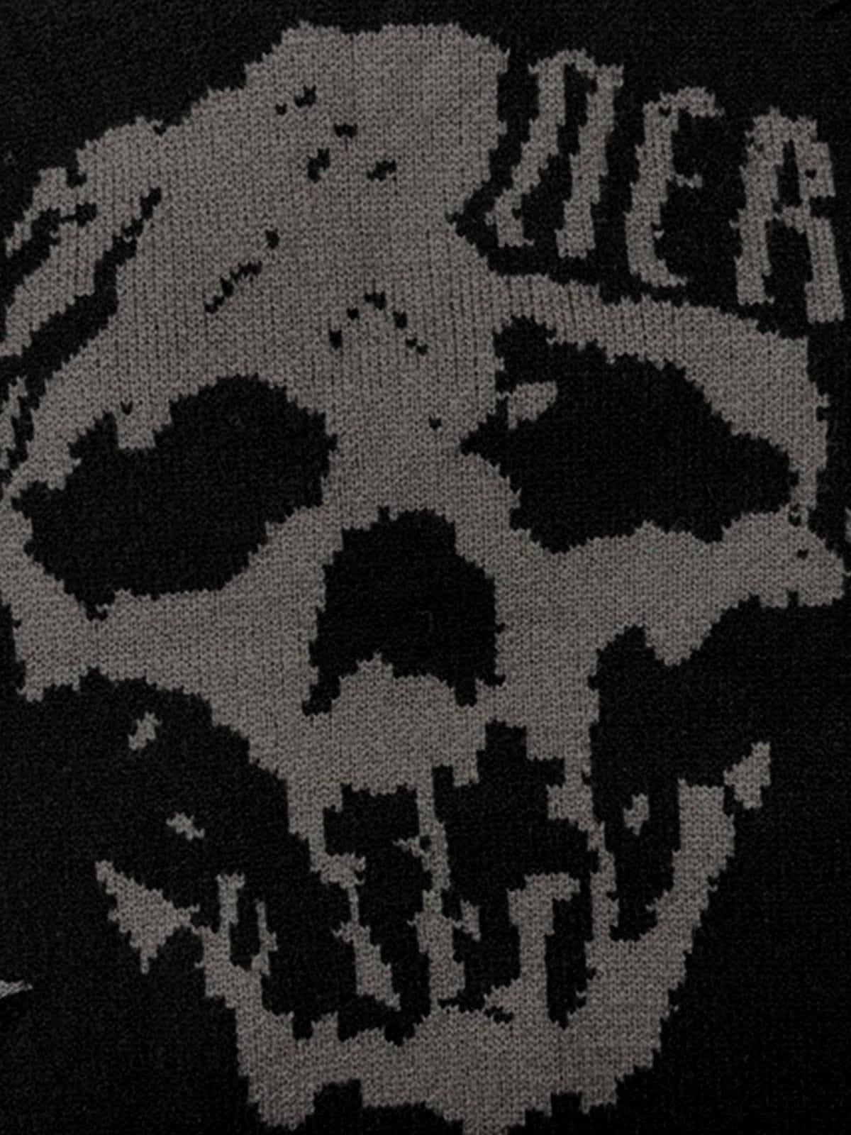 This sweater seamlessly blends a striking skull graphic with distressed details, showcasing a unique texture and street-ready vibe while ensuring both comfort and style.