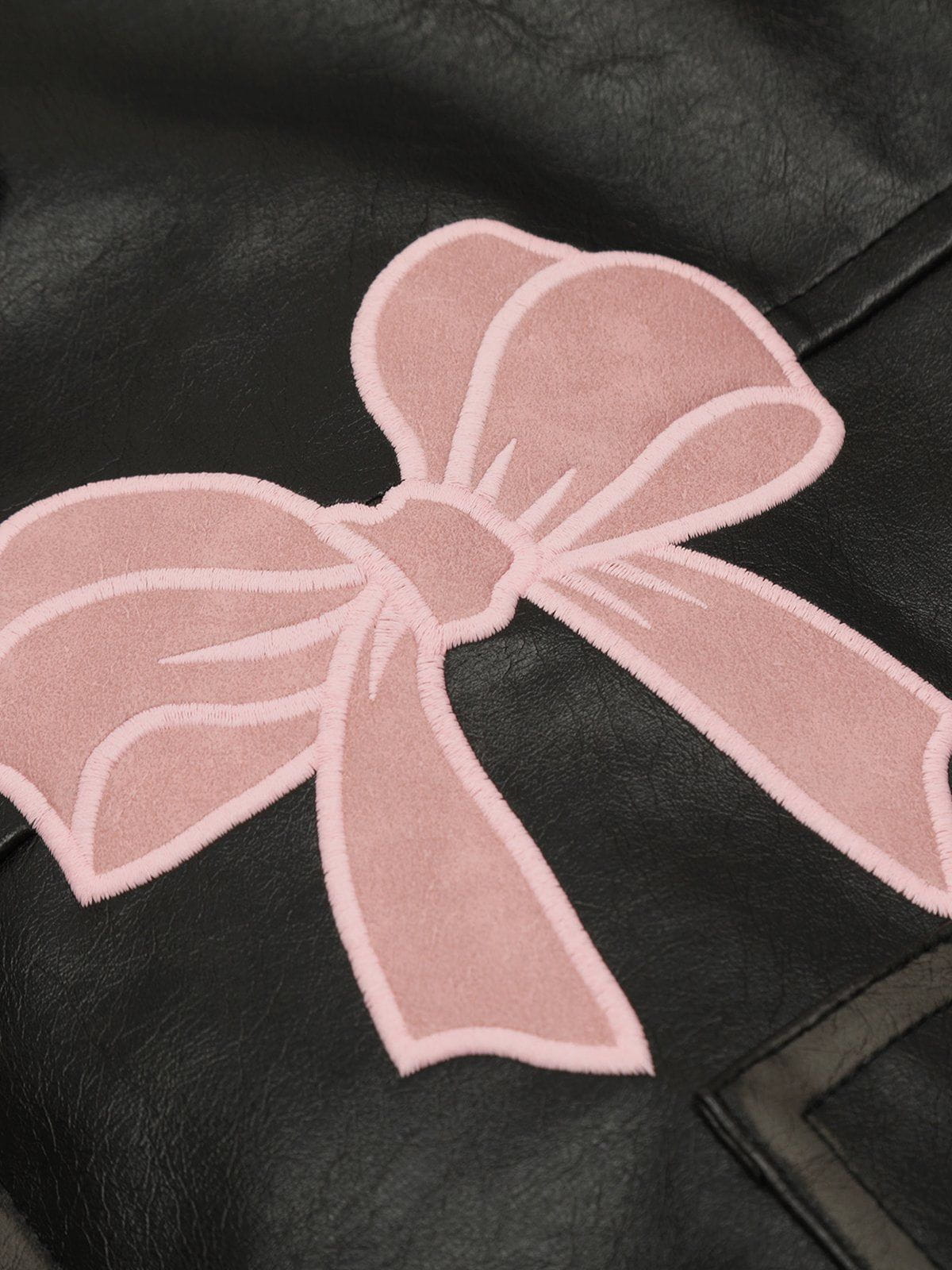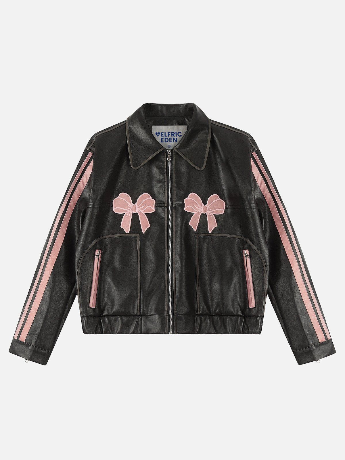 The unique embroidery bow and stripe sleeve add a touch of elegance to this modern jacket. Crafted with high-quality faux leather, it's both stylish and durable. Elevate your wardrobe with this statement piece and make a lasting impression.