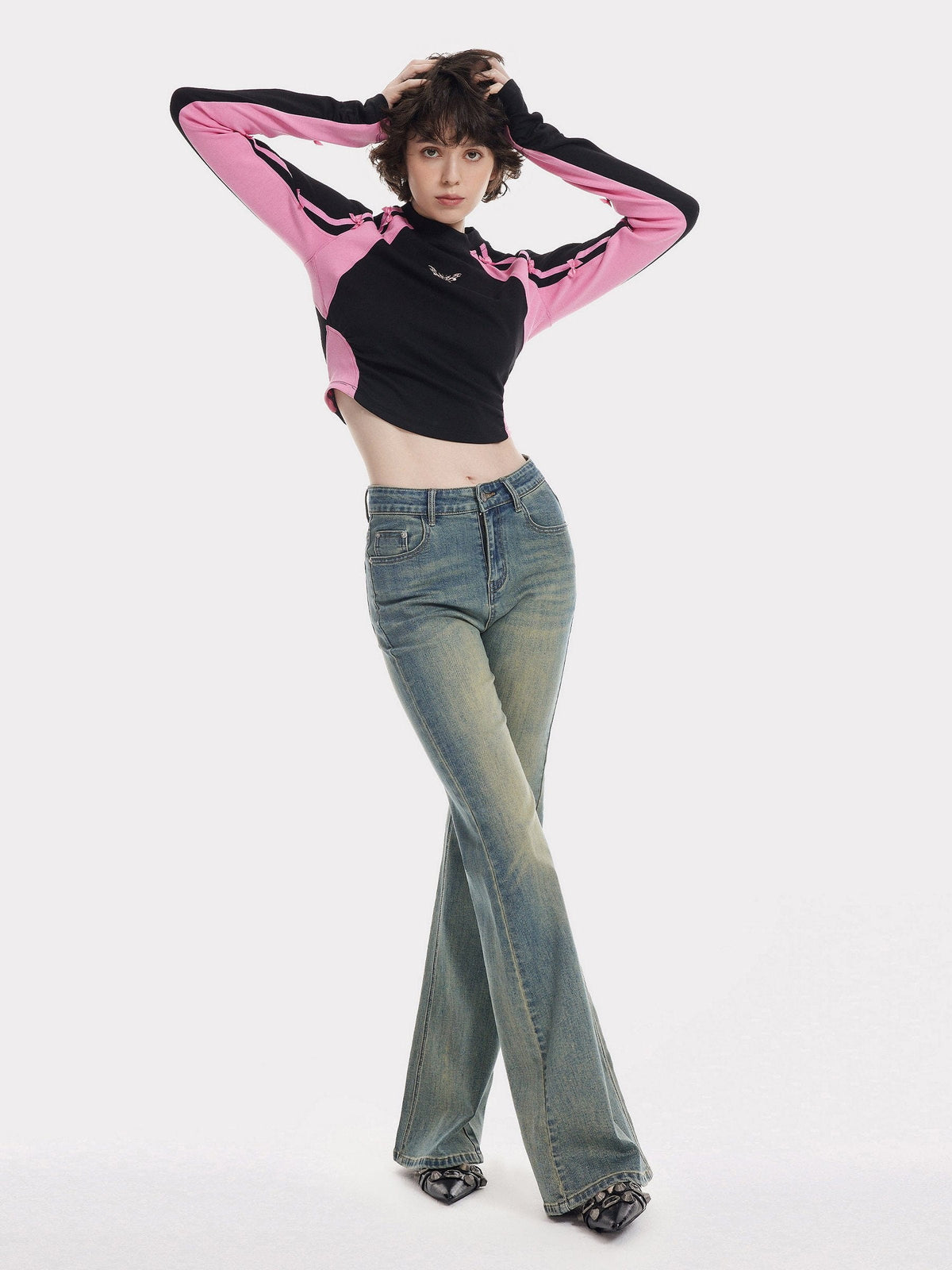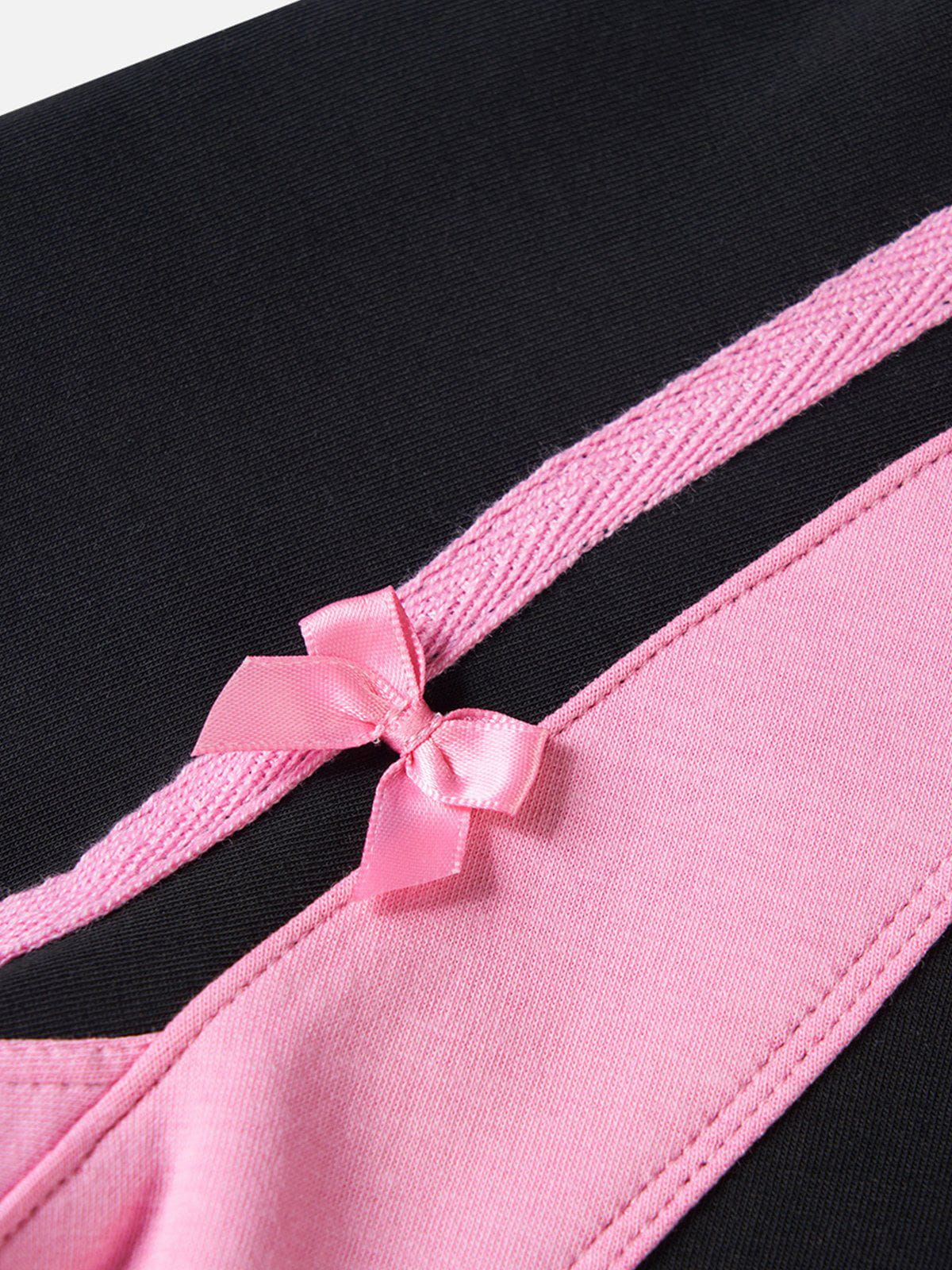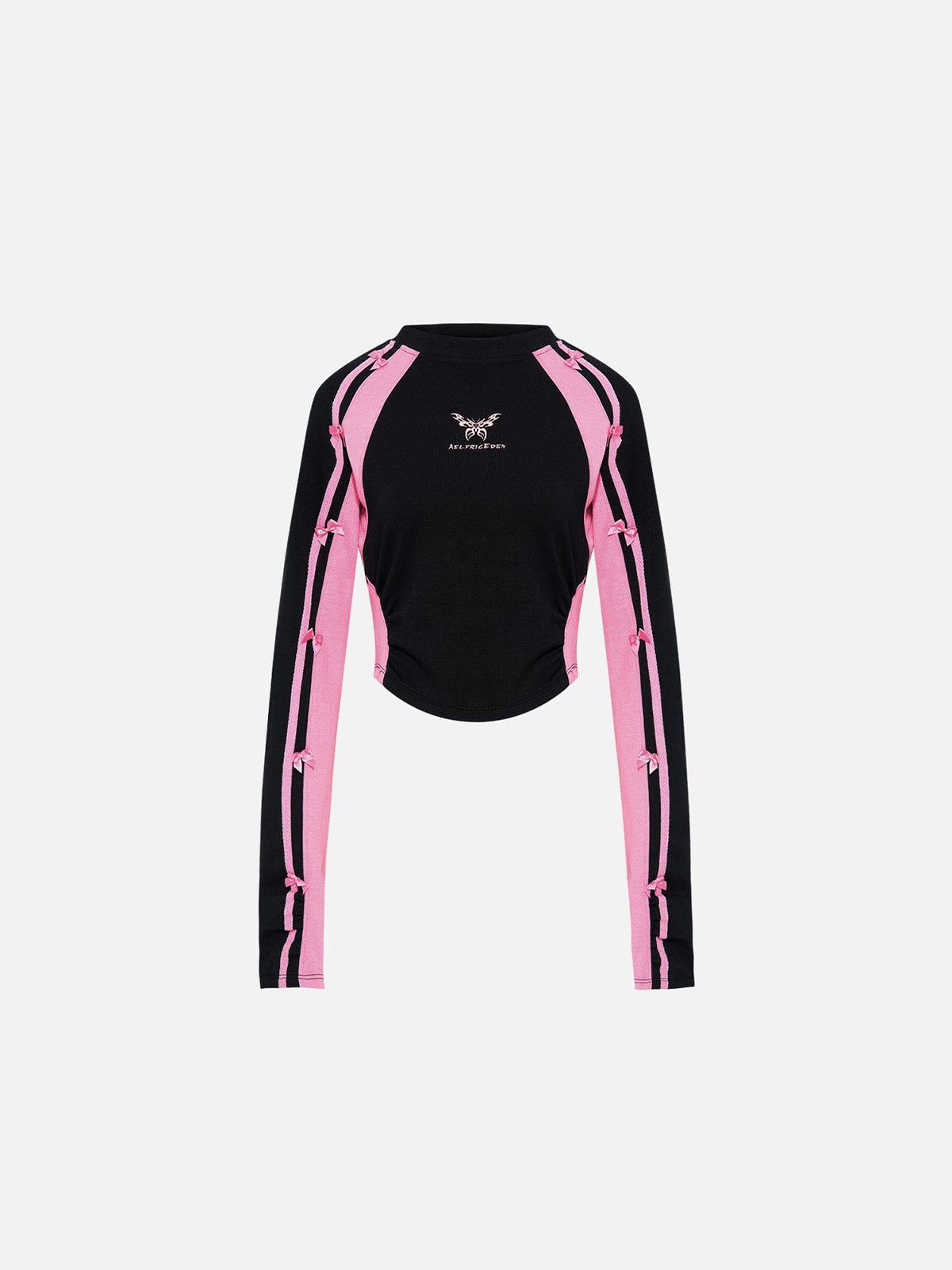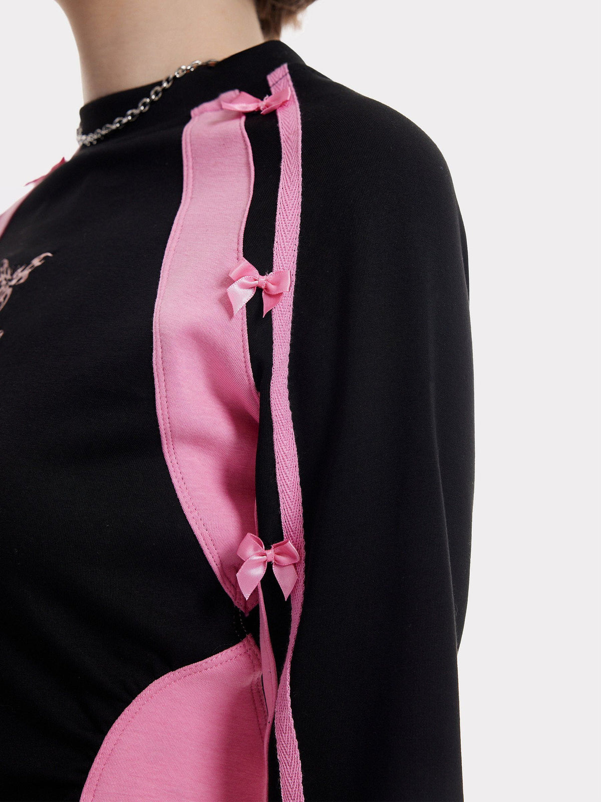 This women's long-sleeve top cleverly combines the elegance of black with the sweetness of pink. The overall black hue exudes a mysterious aura, while the pink accents add a touch of liveliness. The carefully arranged bows on the sleeves resemble little butterflies resting, playful and lively, contrasting sharply with the black, like stars in the night sky, dazzling and bright.
