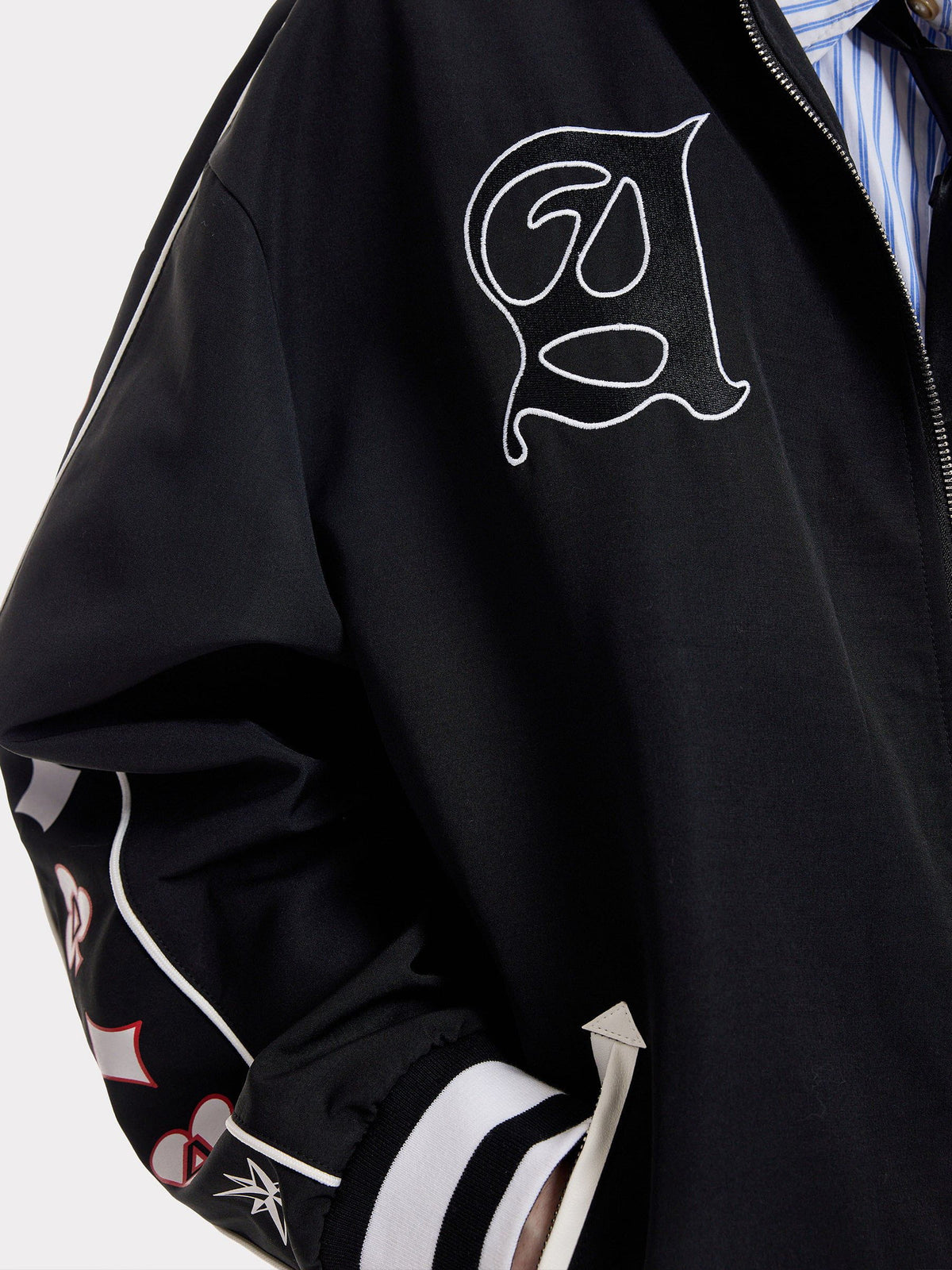 Introducing our ocean-inspired jacket, featuring a striking black color as the primary hue. The bold contrast of black, white, and red delivers a visual impact, while side details with playing card motifs symbolize risk and opportunity, embodying the spirit of adventure.