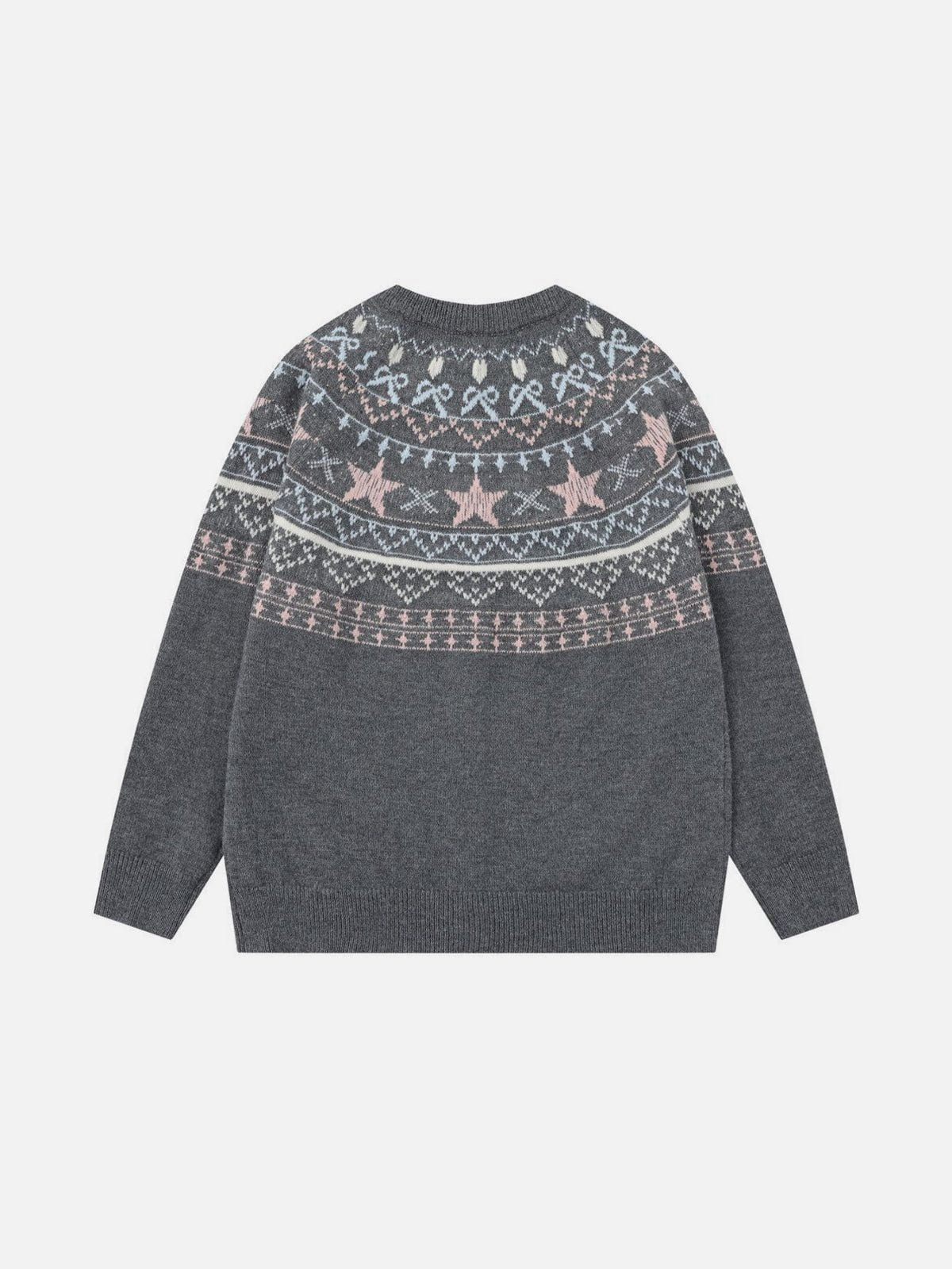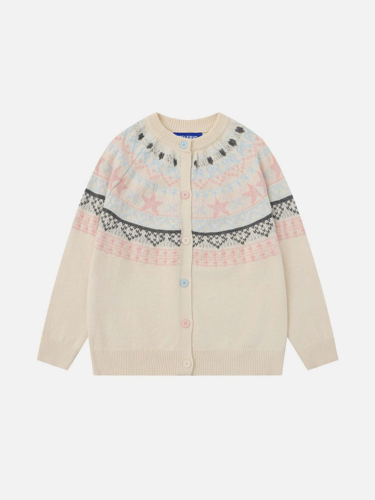 Add a playful touch to your wardrobe with the Fvshya Fair Isle Cardigan, featuring charming star patterns and delicate bow details. This cozy cardigan blends classic Fair Isle style with whimsical accents, making it a unique statement piece that brings both warmth and personality to any outfit.