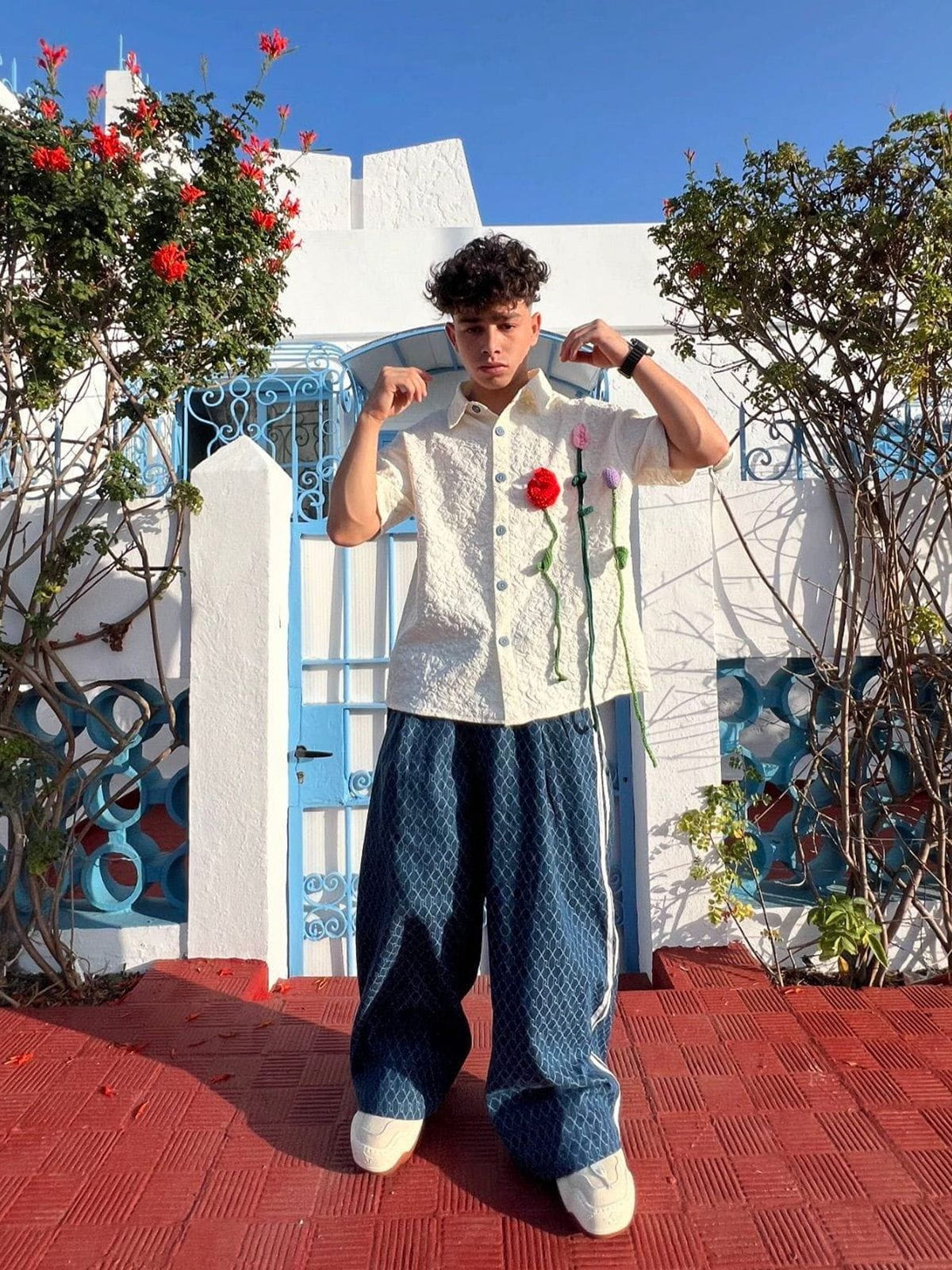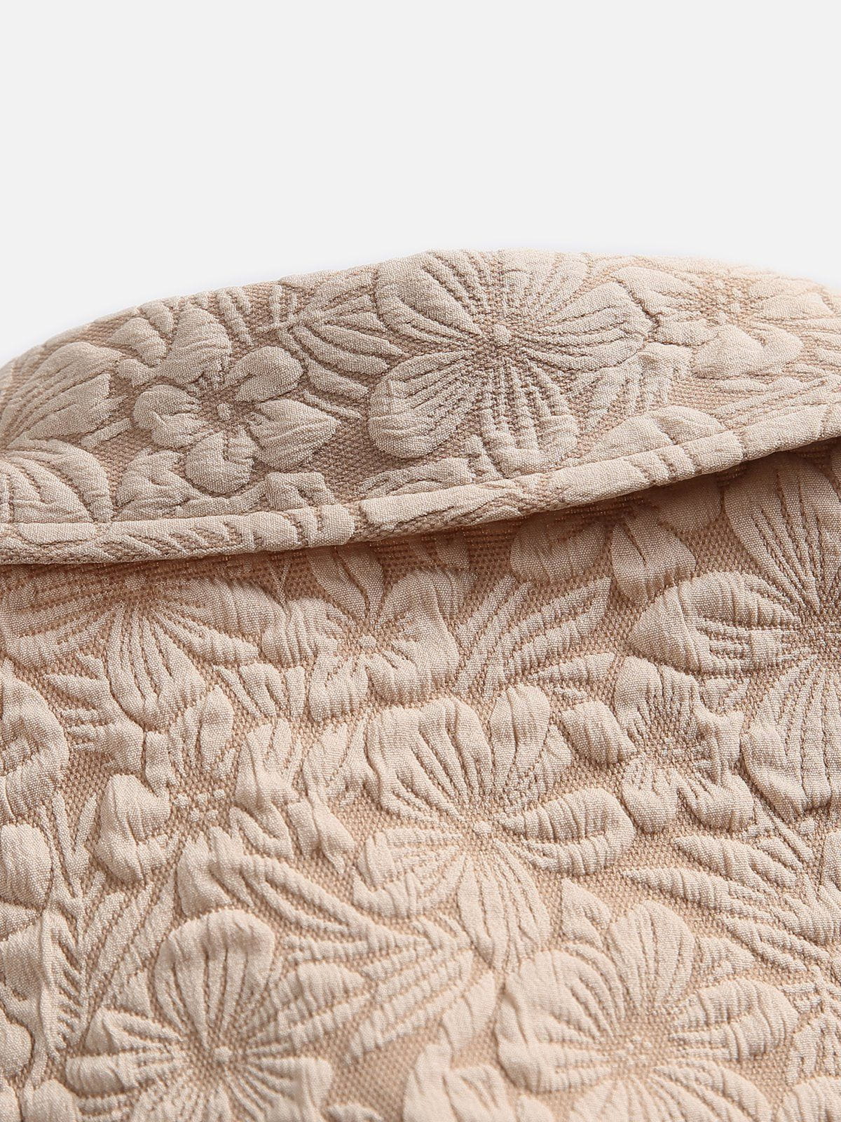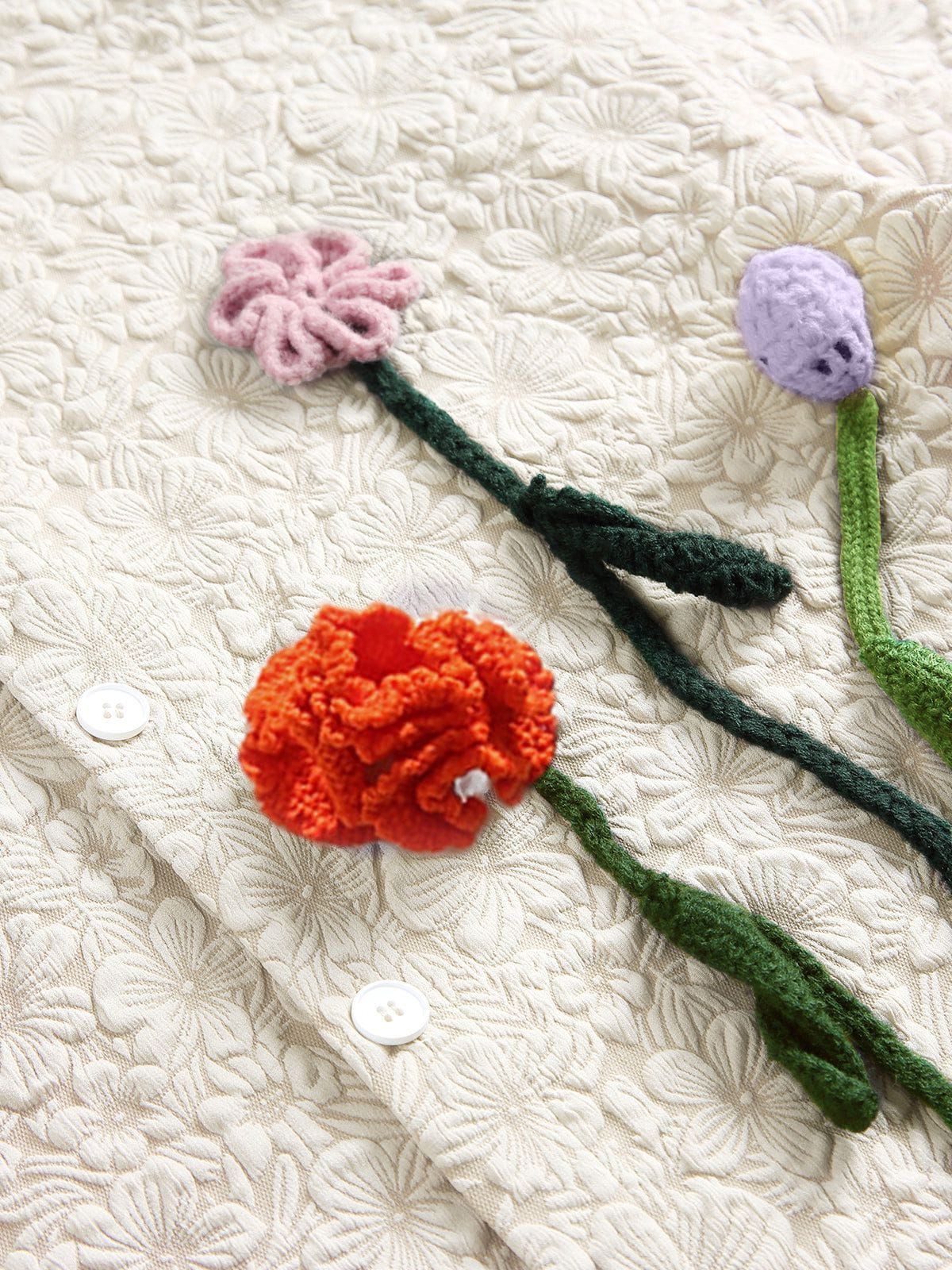 The shirt showcases intricate design elements. Its fabric boasts a subtle floral patterned texture, adding depth and dimension to the overall look. Additionally, the handcrafted woven floral bouquet design on one side of the shirt adds a touch of sophistication and refinement. This clever design not only demonstrates the designer's attention to detail but also imbues the shirt with a sense of luxury and elegance.