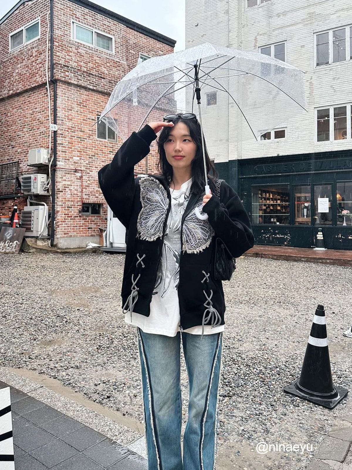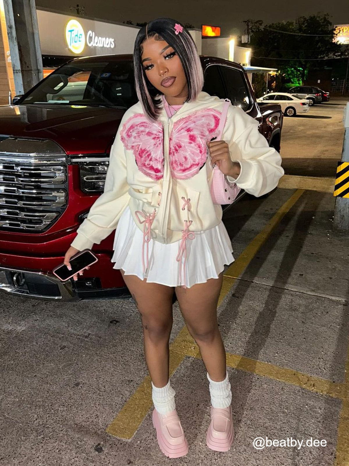 The standout feature is the denim butterfly patch carefully adhered to the fabric, adding a touch of nature's beauty. The pocket is adorned with a butterfly bow-tie design, combining whimsy with casual chic.