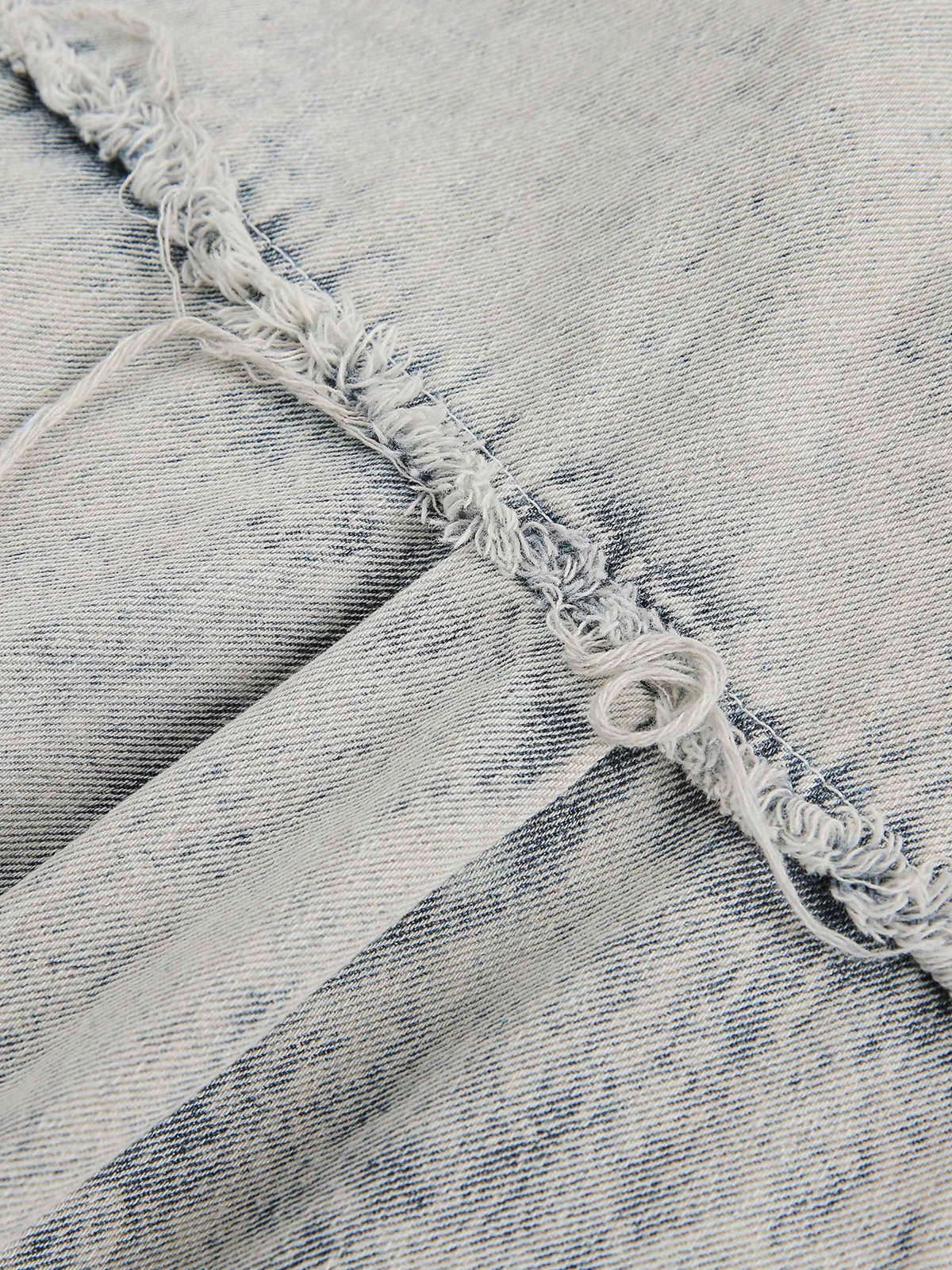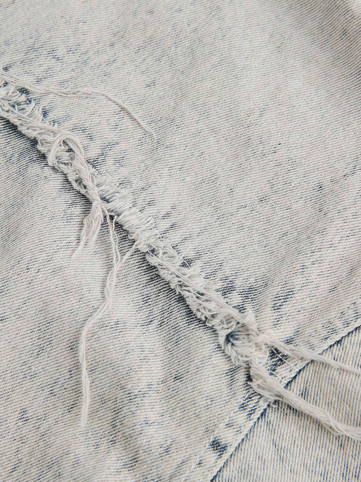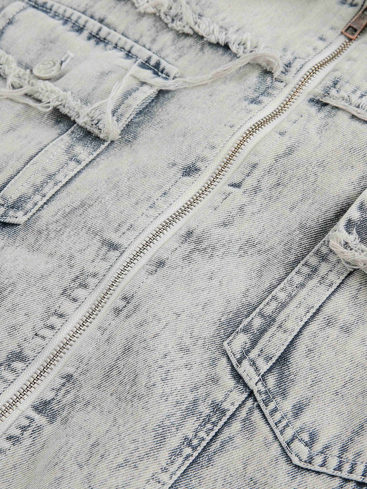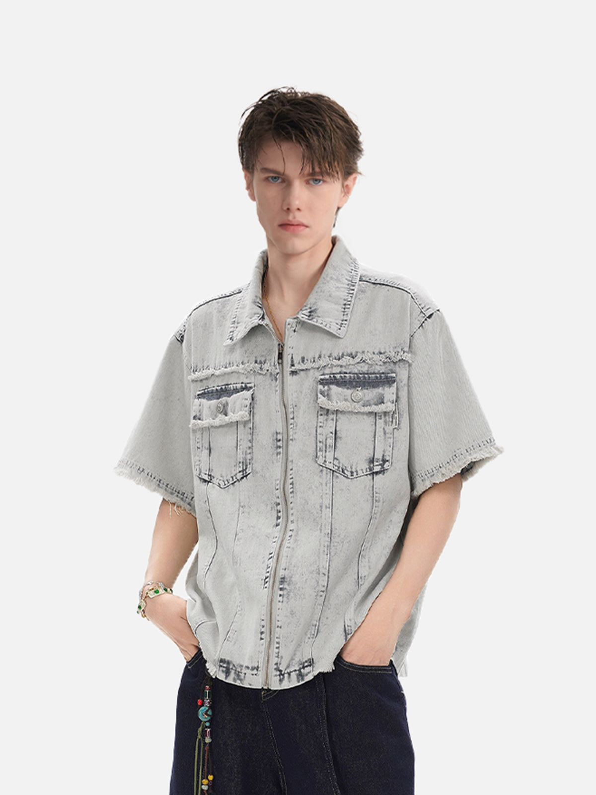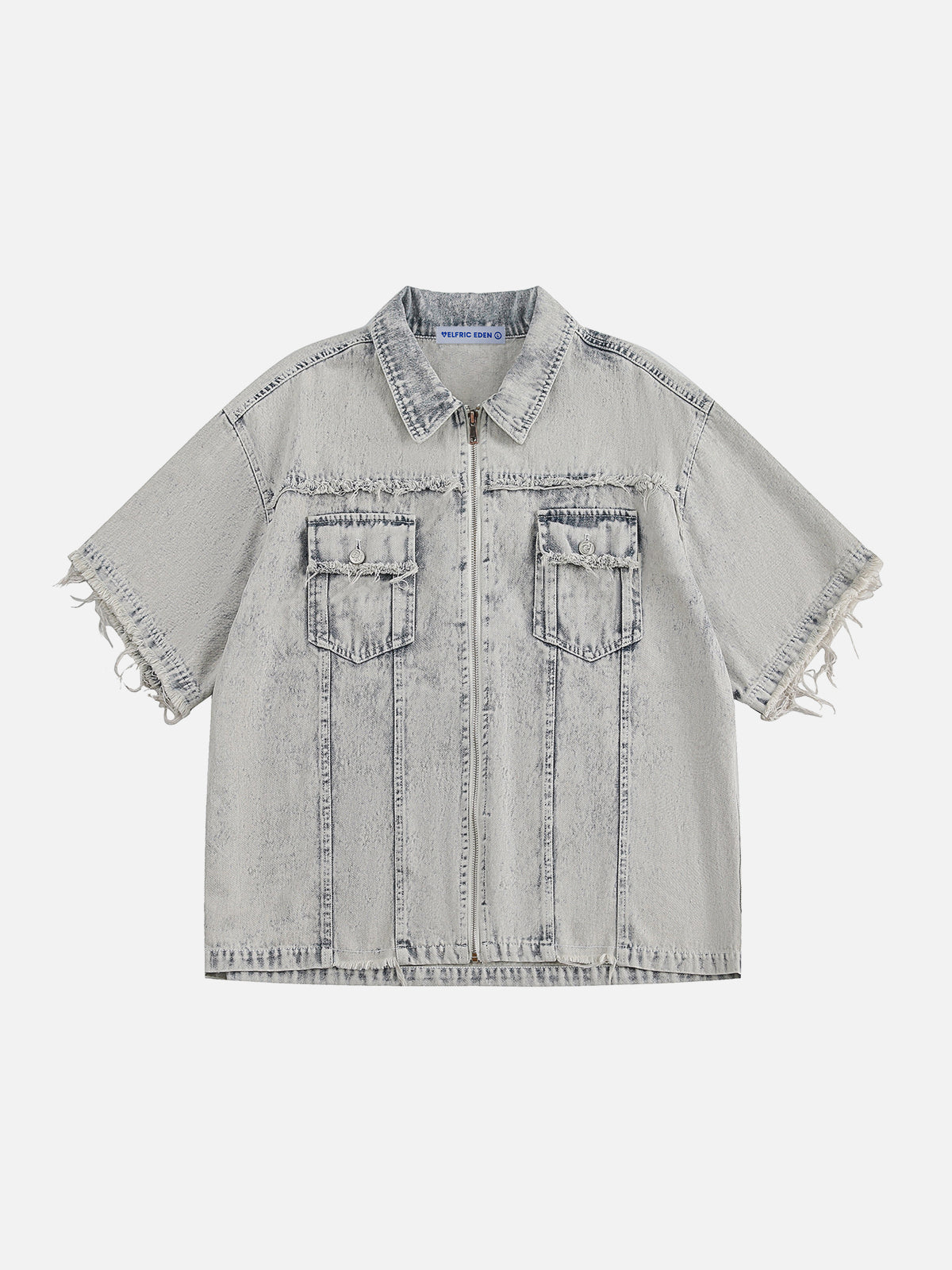 Fringe-trimmed sleeves and a washed-out finish give this denim shirt a worn-in, retro feel. The short sleeve design and zip closure make it a versatile layering piece for casual days with character.