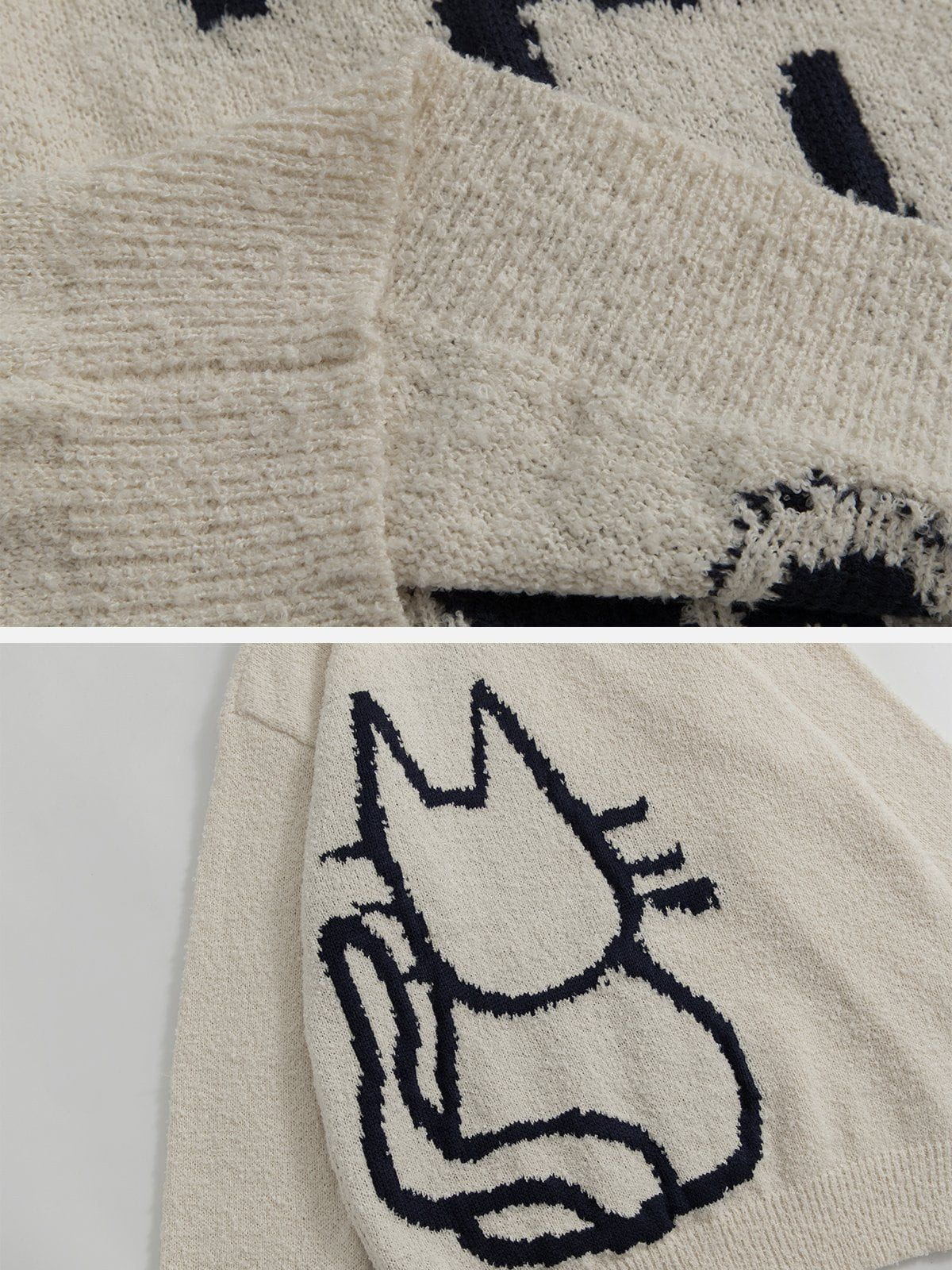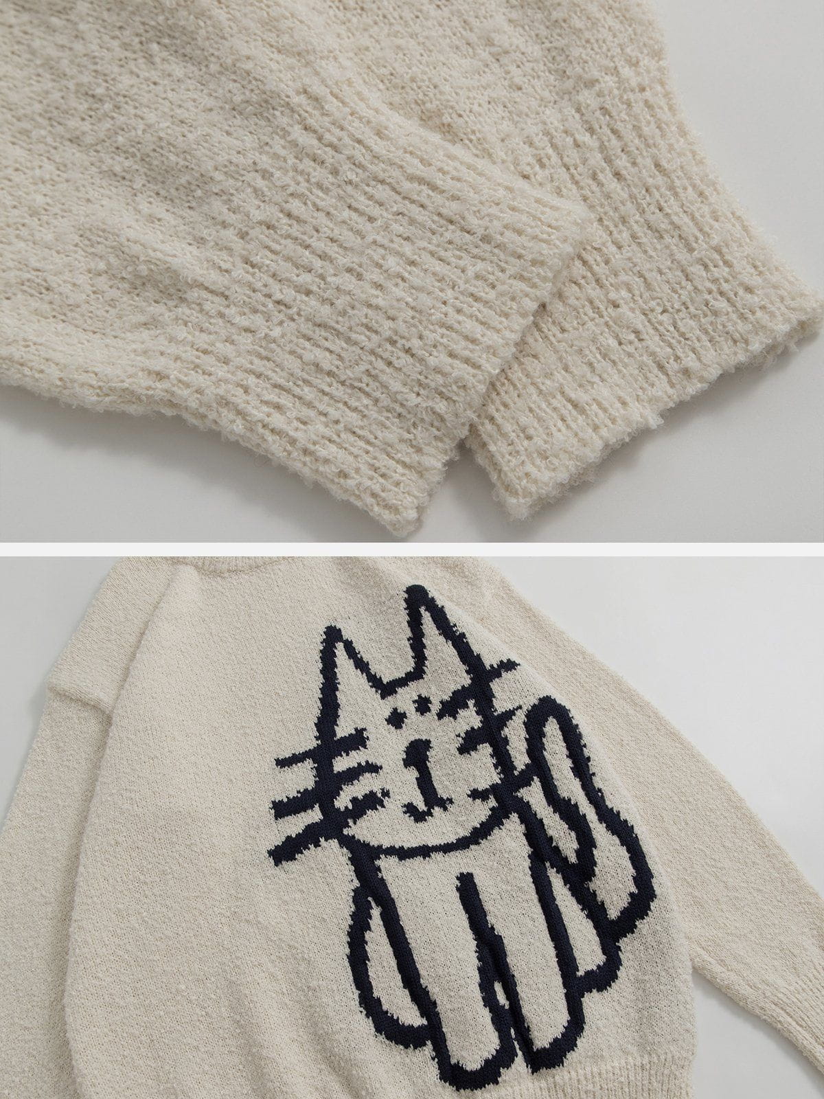 Two color schemes in black and white. The simple lines outline a cat in a fun way. You can show off your unique dressing sense. The skin-friendly texture of the sweater will never make you regret your purchase either.