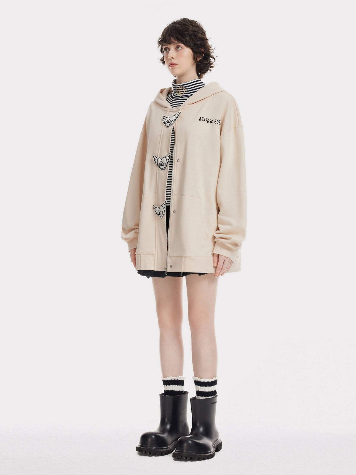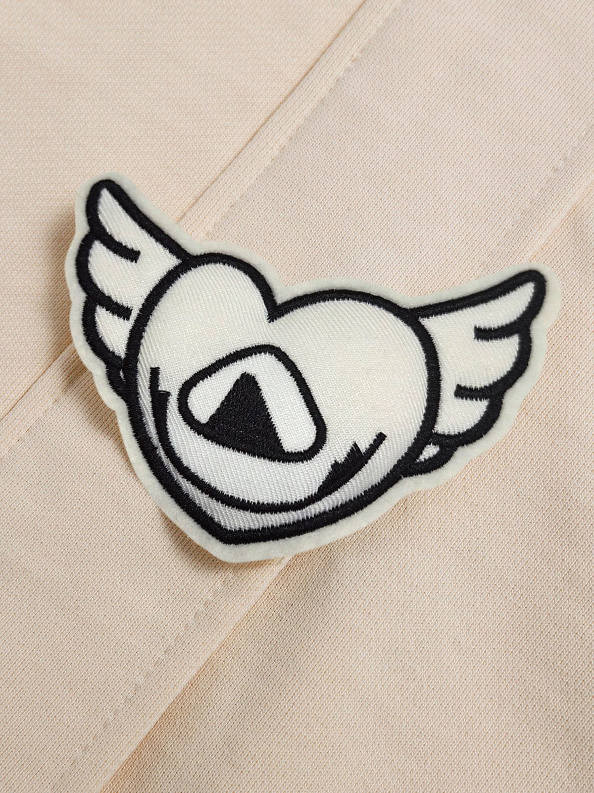 The outer layer of the zipper features three button accents, each adorned with whimsical winged heart-shaped eyes. At the forefront, the  "Fvshya" brand embroidery, and the subtle yet striking detail of metal button embellishments along the pocket edge add a hint of luxury and refinement to the overall design.