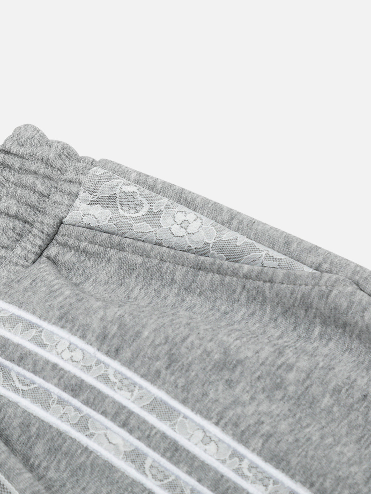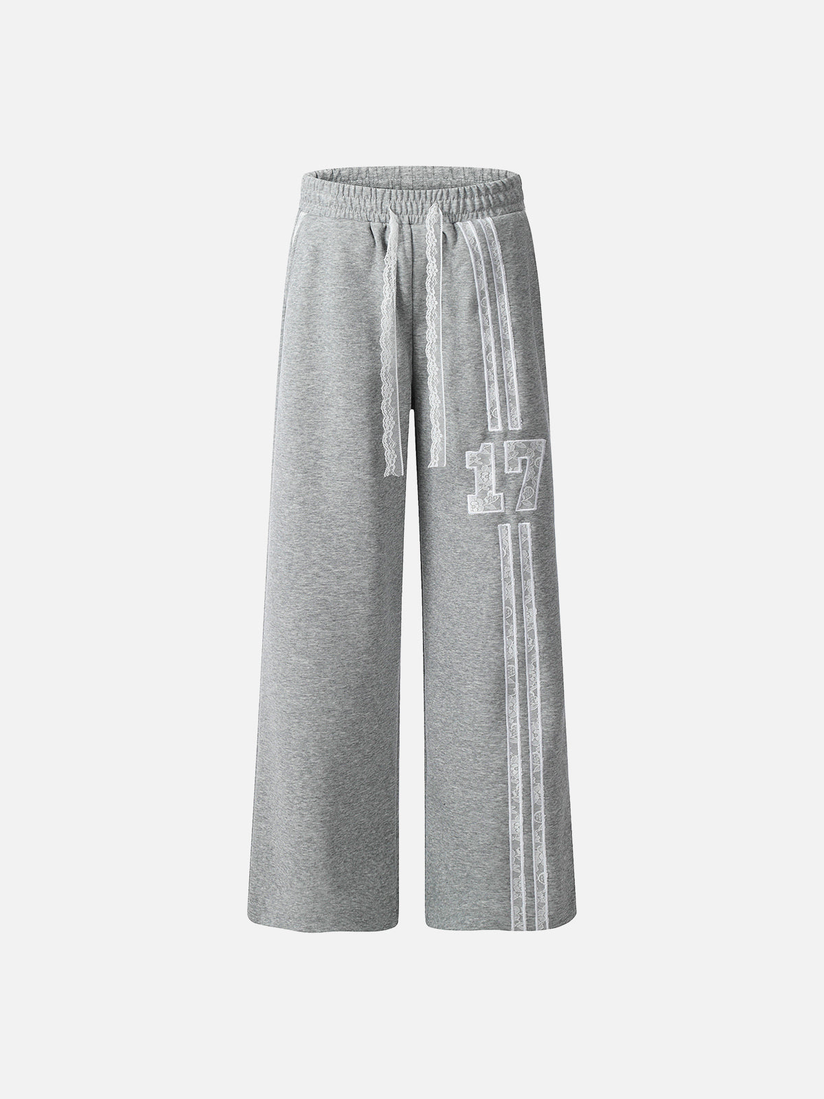 These sweatpants blend sporty comfort with delicate details. Featuring lace-trimmed side stripes and a bold "17" patch, they add a unique twist to casual wear. The wide-leg silhouette and adjustable drawstring waist ensure a relaxed fit, perfect for lounging or pairing with sneakers for an elevated streetwear vibe.