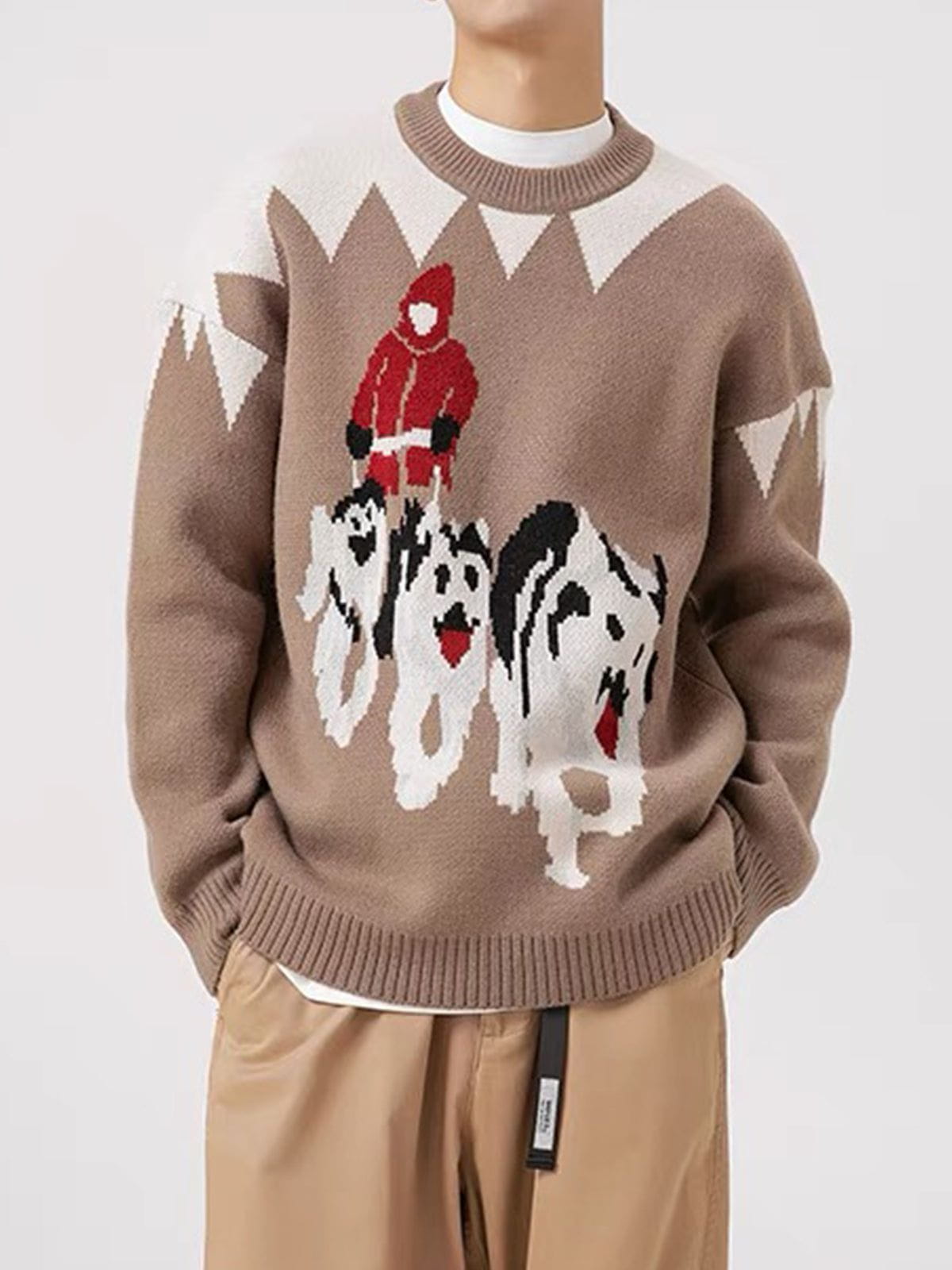This Sled Dogs Jacquard Sweater is perfect for keeping warm during cold winters. Crafted from high quality fabric, the sweater features a jacquard pattern of sled dogs for a cozy, festive feel.🎄🎁