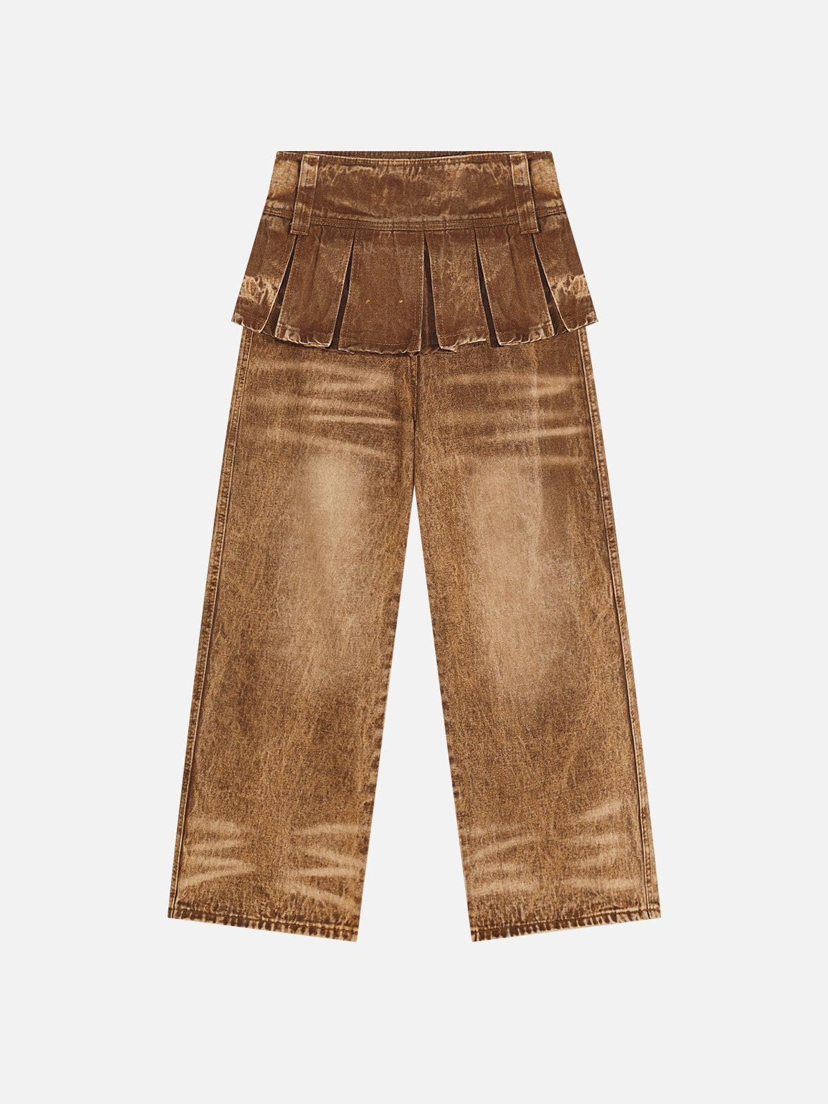 Crafted in a vintage wash in a rich sepia hue, the eye-catching frayed overlay design mimics the shape of a skirt from the back. The layered design adds structure and visual appeal, blending practical denim style with playful elements.