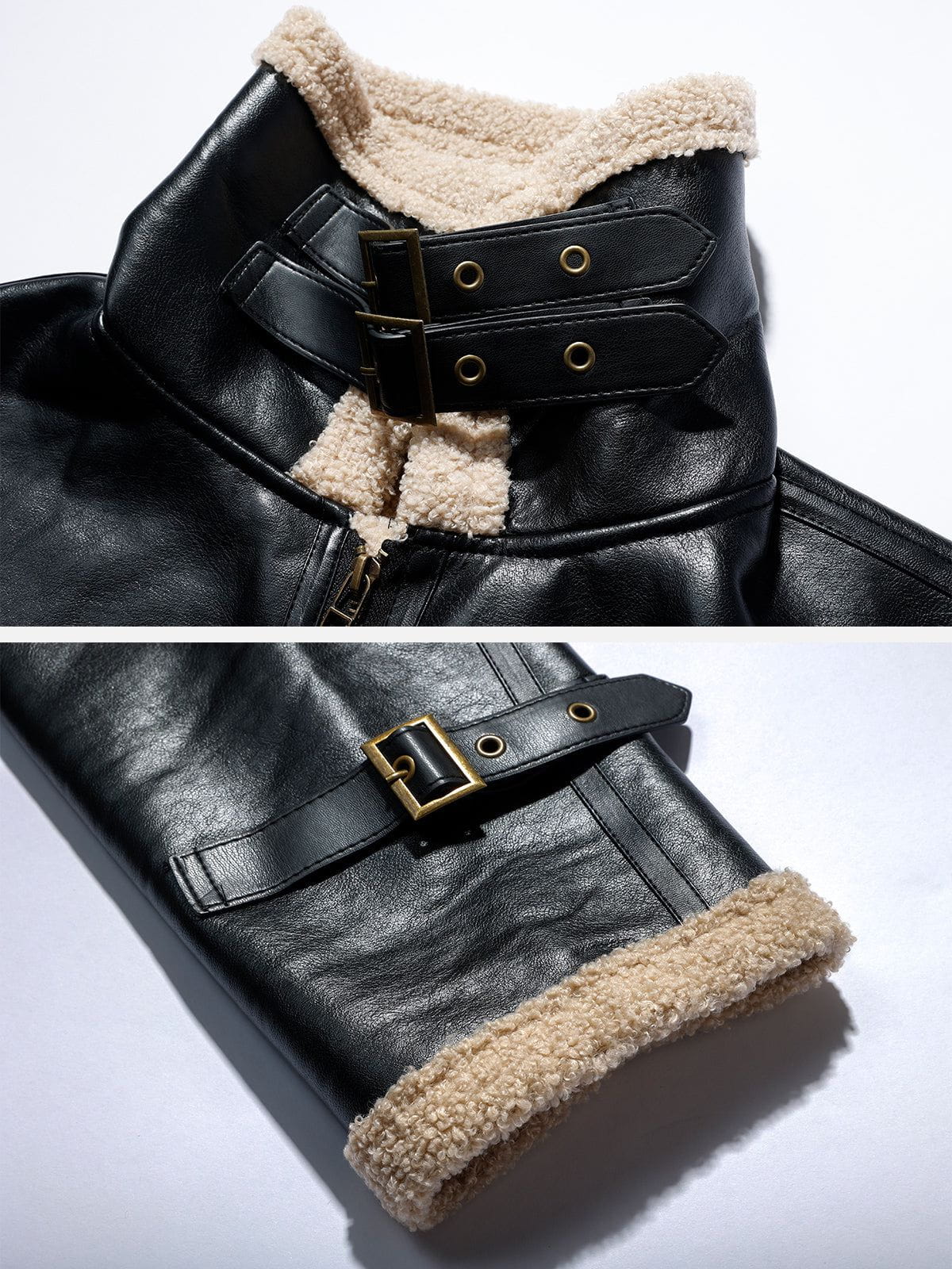 Adjustable button shearling cuffs + Adjustable button shearling hem,