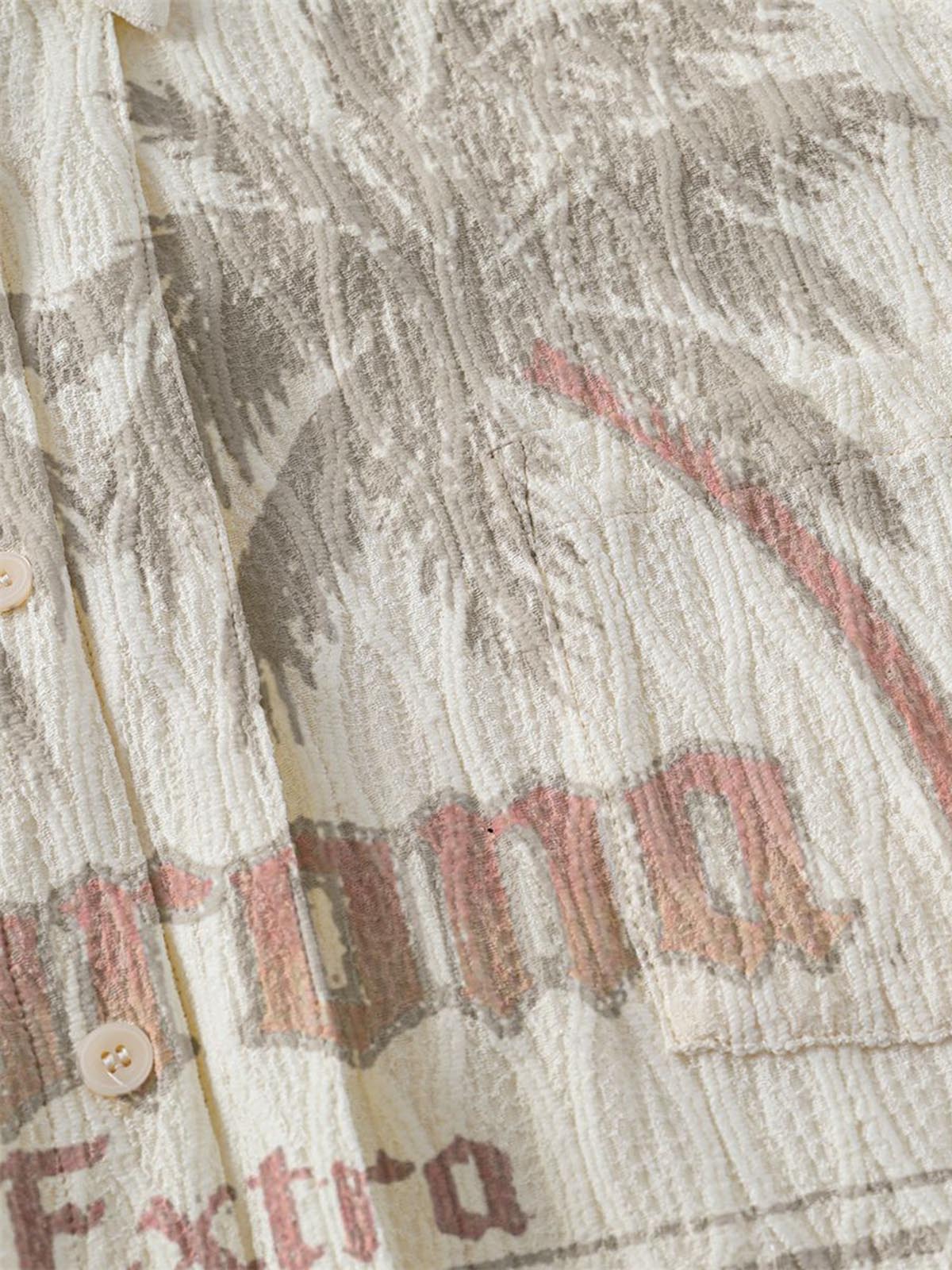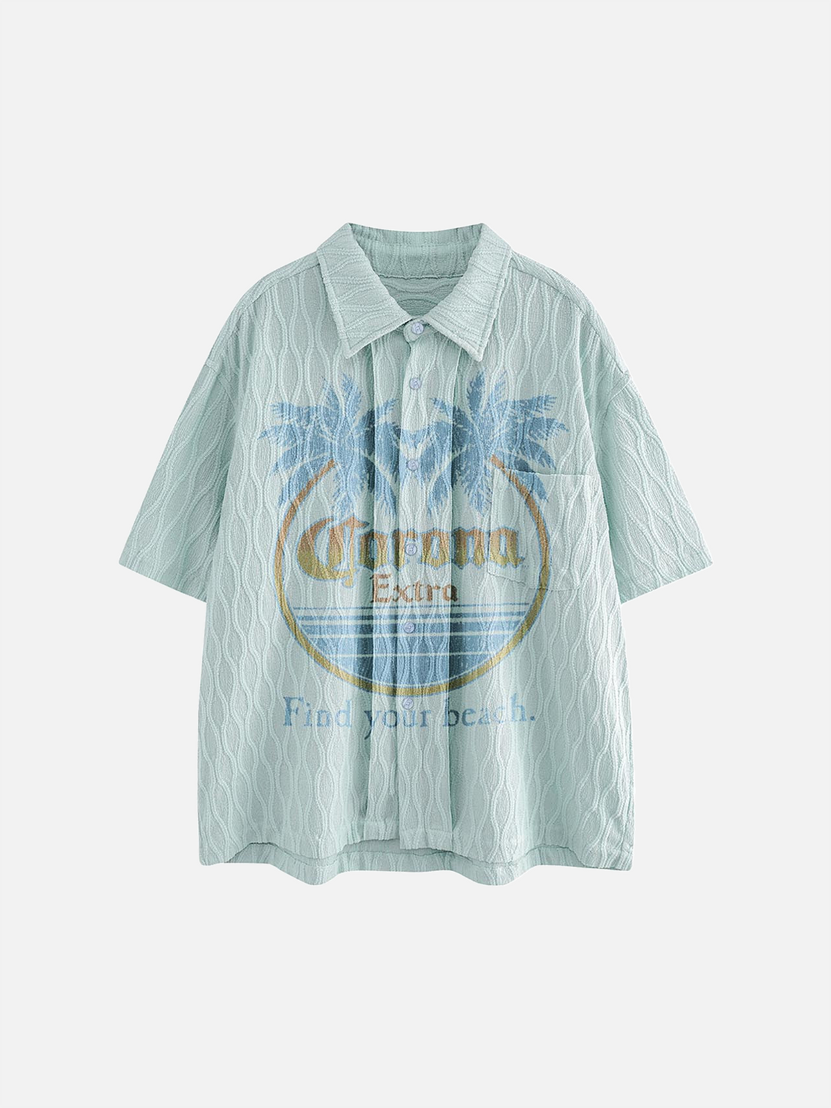 • Design Elements: Tropical palm tree print, circular logo design, "Find your beach" slogan