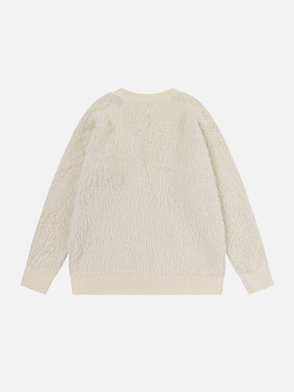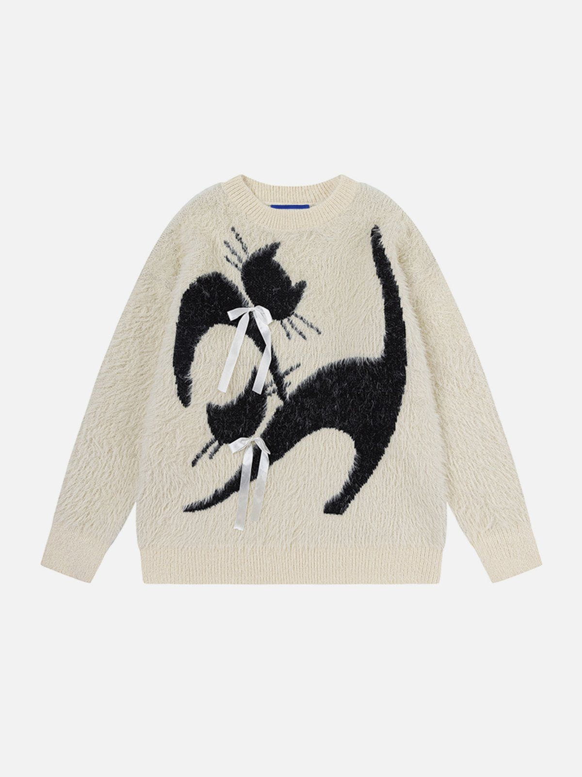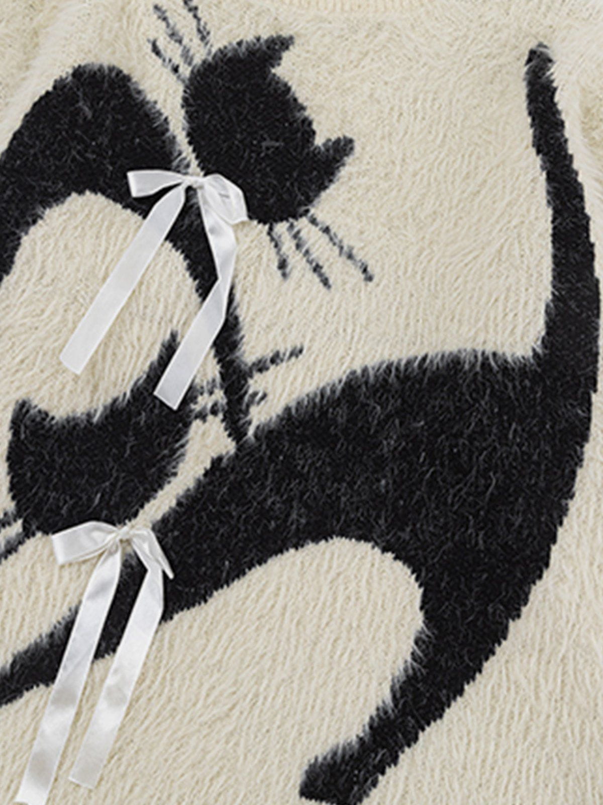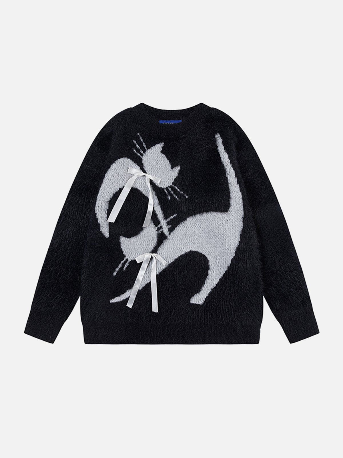 This Bow Cat Graphic Sweater showcases two simple cat silhouettes with just their outlines. Each cat is accented by a charming ribbon bow tied around its neck, creating a playful yet stylish look. Perfect for adding a touch of whimsy to your wardrobe.
